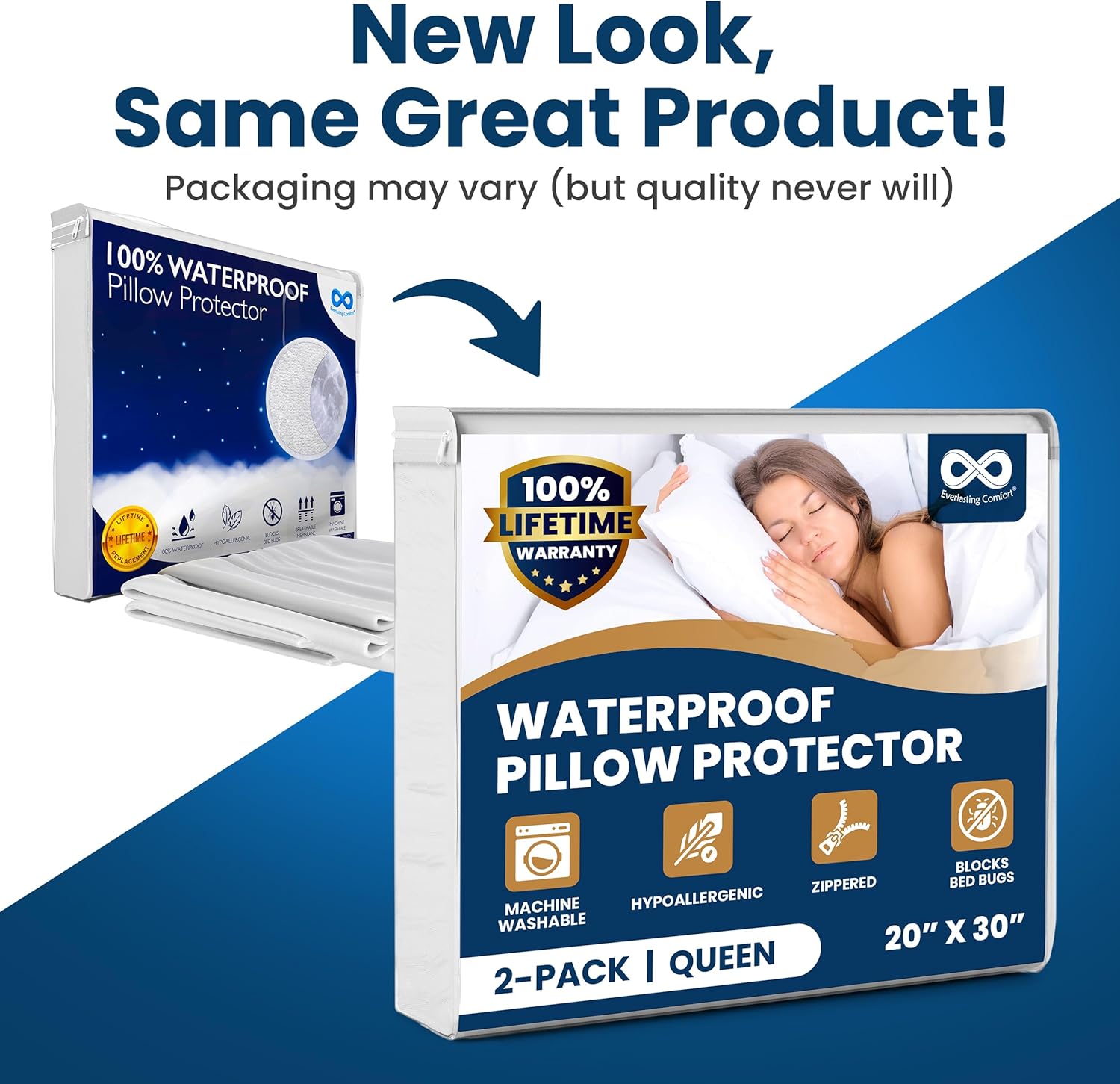 100% Stain Resistant & Waterproof Queen Size Pillow Protectors with Zipper Set of 2 - Bed Bug & Dust Mite Proof White Pillowcases - Breathable, Comfortable Pack of Covers for Pillows, 20 x 30 Inches