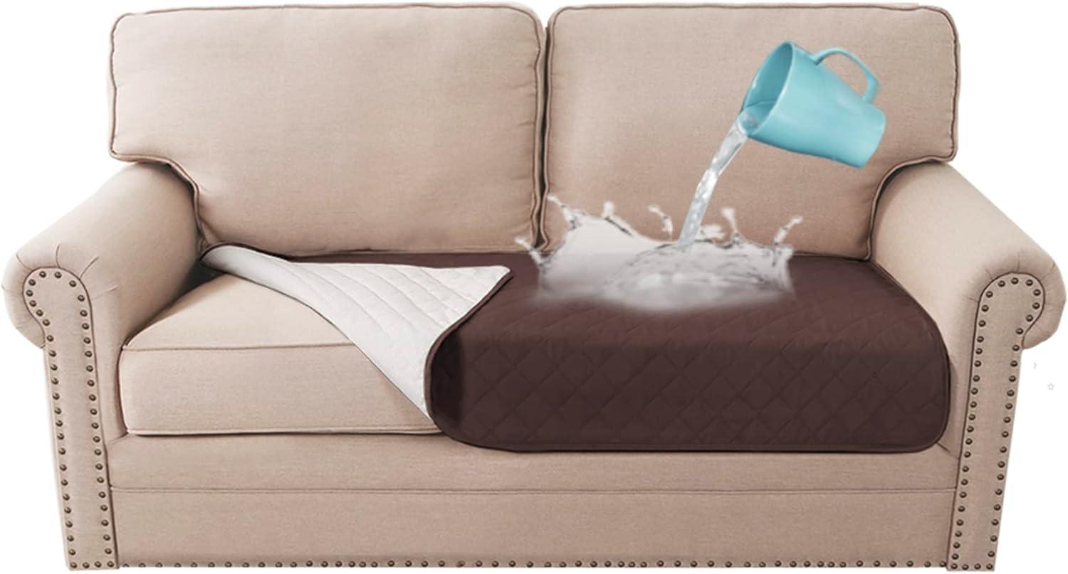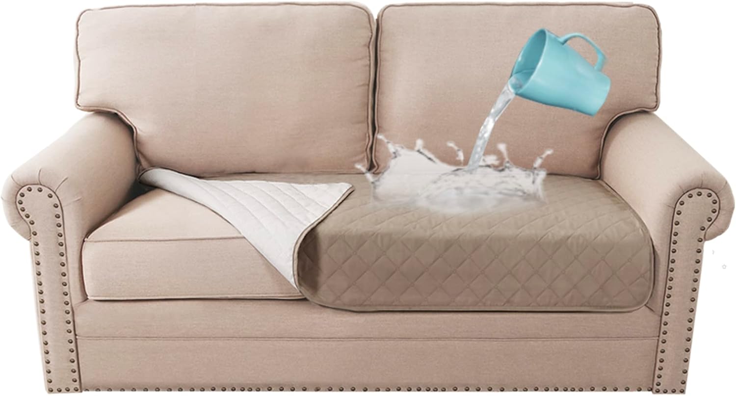 IT REPELS LIQUIDS!Our reversible sofa cover is water-resistant not waterproof. you can use a wet clean cloth to wipe off dirts and stain instead of washing to prolong the the cover's useful lifetime.Our 5-LAYERS CONSTRUCTIONWater repellent quality microfiber fabricSoft&Comfortable textile fiber filling100%Waterproof TPU Memberane layerQuality microfiber fabricNo-skid silicone drops backing.FULL PROTECTIONProtect your furniture from spills, pets fur, stains, and normal wear and tear or any possible mess and accidents. Great choice for homes with children and pets, you could share happy time with your pets and kids3 SIZES AVAILABLE35'' x 62'',suitable for most 2 seater loveseat sofas.35'' x 74'',suitable for most 3 seater sofas.35'' x 82'',suitable for most 3 seater oversized sofas.CARE INSTRUCTIONMachine washing in cold, do not bleach, tumble dry low