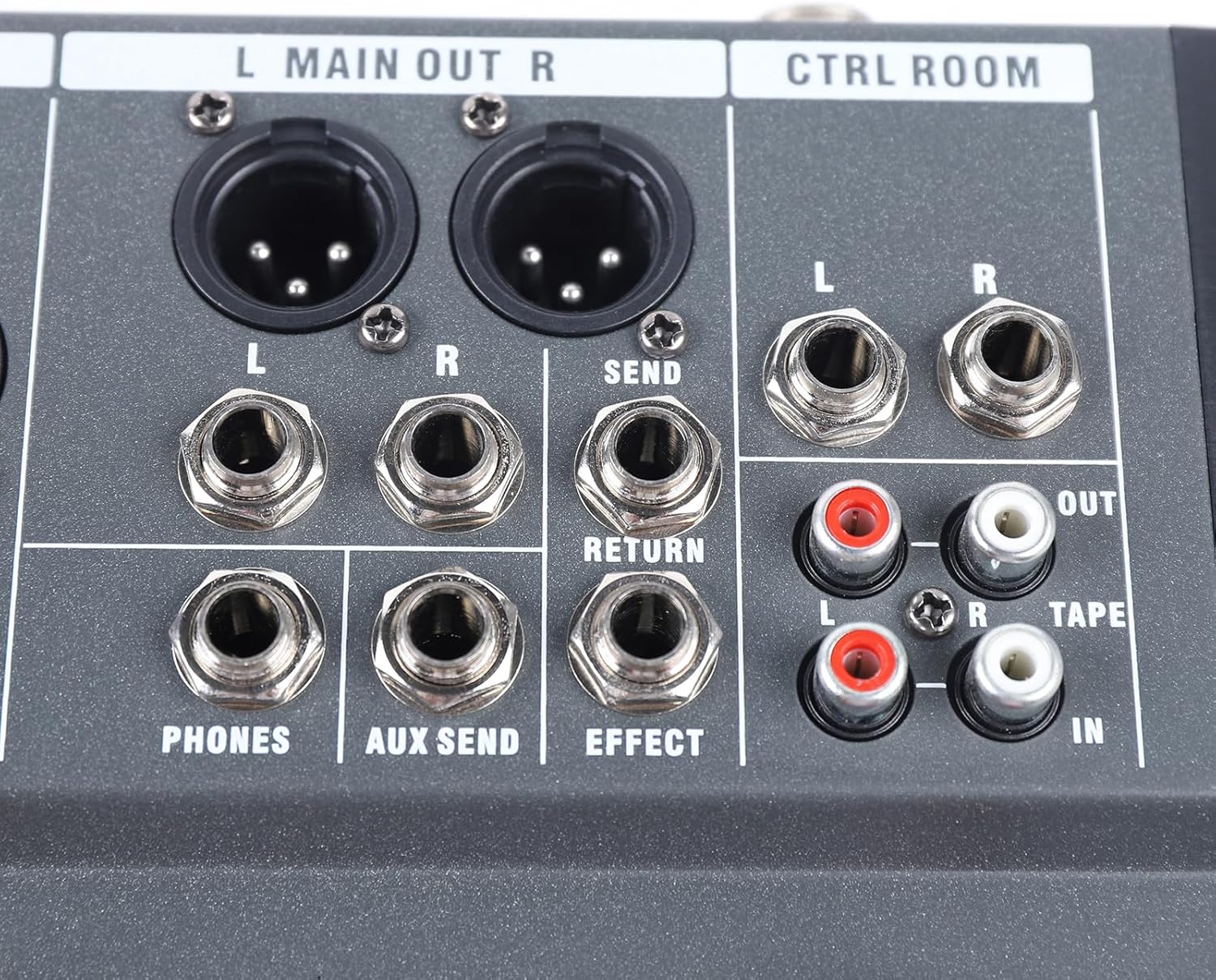 Application It is suitable for home KTV, campus language, conferences, bars, stage performances, music dining bars, recording studio, etc. Specification 1. Channel: 12 channels 2. Maximum input level of microphone: +24dBu 3. Maximum input level of line: +24dBu 4. Maximum input level: XLR+26dBu 5. Frequency response: 20Hz-30kHz±0.5dB 6. Max Input Power: 15W 7. THD+N: <0.01% 8. Crosstalk (1kHz): > 85dB 9. Noise (22Hz to 22KHz): equivalent input noise -122dbu, residual output noise <-90dbu 10. Mono/Stereo channel EQ: High frequency, broom type, +/-15db, 12KHz Low frequency, broom type, +/-15db, 80KHz Mid-high frequency, peak type, +/-15db, 2.5KHz 11. Mono XLR: 2PIN, 2Kohm, -60~+14dbu sensitivity TRS: tip, 10Kohm, -40~+14dbu sensitivity XLR: +48V Material: Metal+plastic Size(approx): 51.6cm x34cm x3.7cm Weight: 5.9kg Package included 1 x Mixing Console 1 x Power Cable 1 x User Manual Notes 1.Please read the user manual carefully before use and pay special attention to the safety precautions included. 2.Please note that the product needs to be used with an amplifier. The mixing console itself will have noise <-60BD.