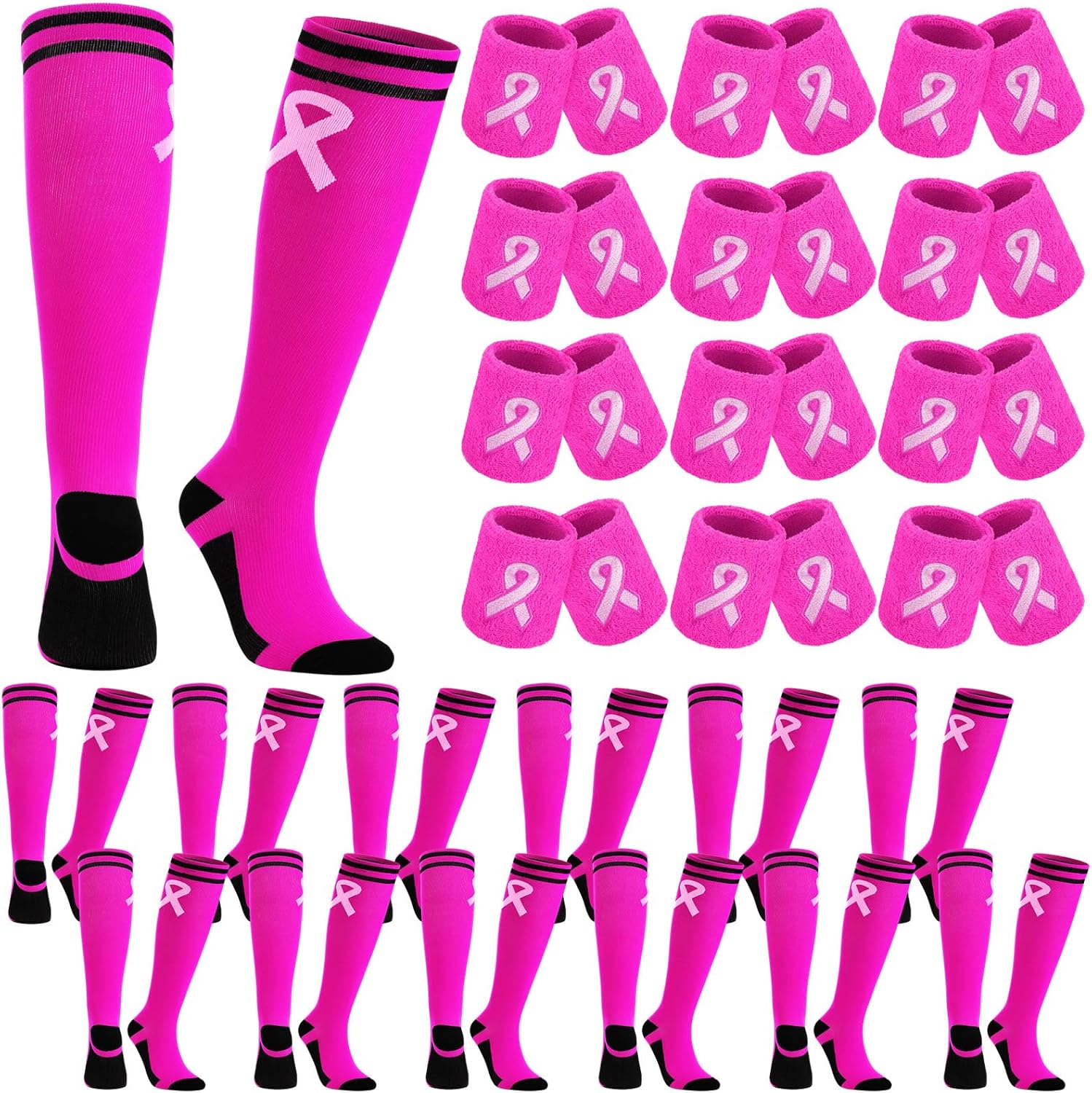 Features: Show your support with style: These breast cancer awareness socks and wristbands are the ideal way to show concern for loved ones, classmates, colleagues and breast cancer survivors and are ideal for soccer games, workouts, or everyday wear to show your support for breast cancer awareness. Ideal gift option: Bring happiness to your loved ones by giving them our soccer breast cancer socks and wristbands. This thoughtful gift is ideal for sports enthusiasts who want to support breast cancer awareness. Specifications: Main material: Socks: 82% acrylic, 6% nylon, 8% poly, and 4% spandex Sweatbands: cotton Color: pink, black Size: Socks: 20.84 inches Sweatbands: 3 x 3.5 inches Package includes: 12 Pair breast cancer socks 12 x Wrist sweatbands Notes: Manual measurement, please allow slight errors on size. The color may exist a slight difference due to different screen displays.