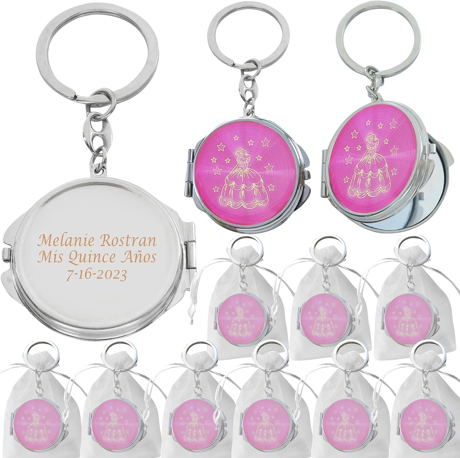 12 pcs Personalized Beautiful sweet 16 Metal compact mirrors keychain feature round shape with both interior surfaces covered with regular and 3x magnified mirrors. This pretty compact mirror is great for any Quinceanera birthday party favor. They come in red, pink, silver, royal blue, and turquoise.