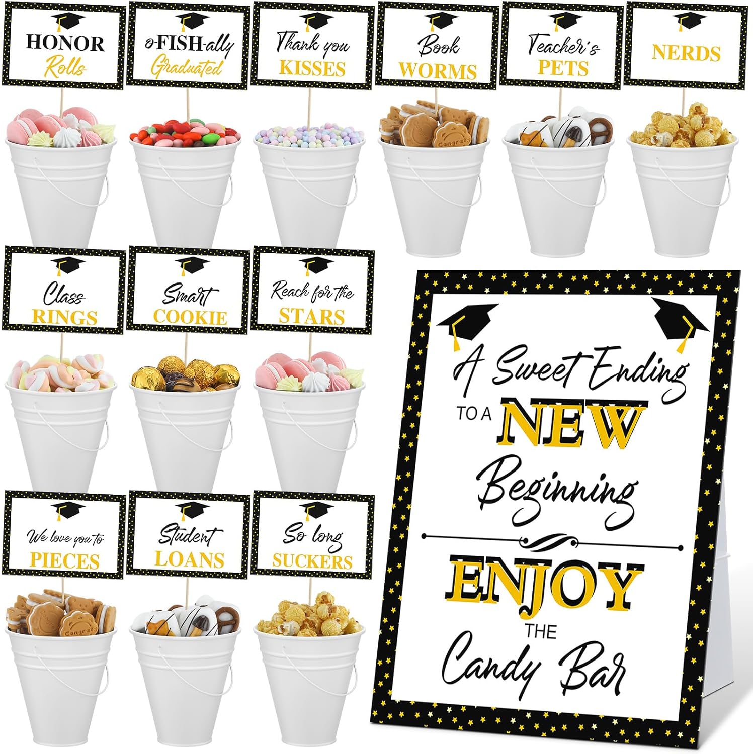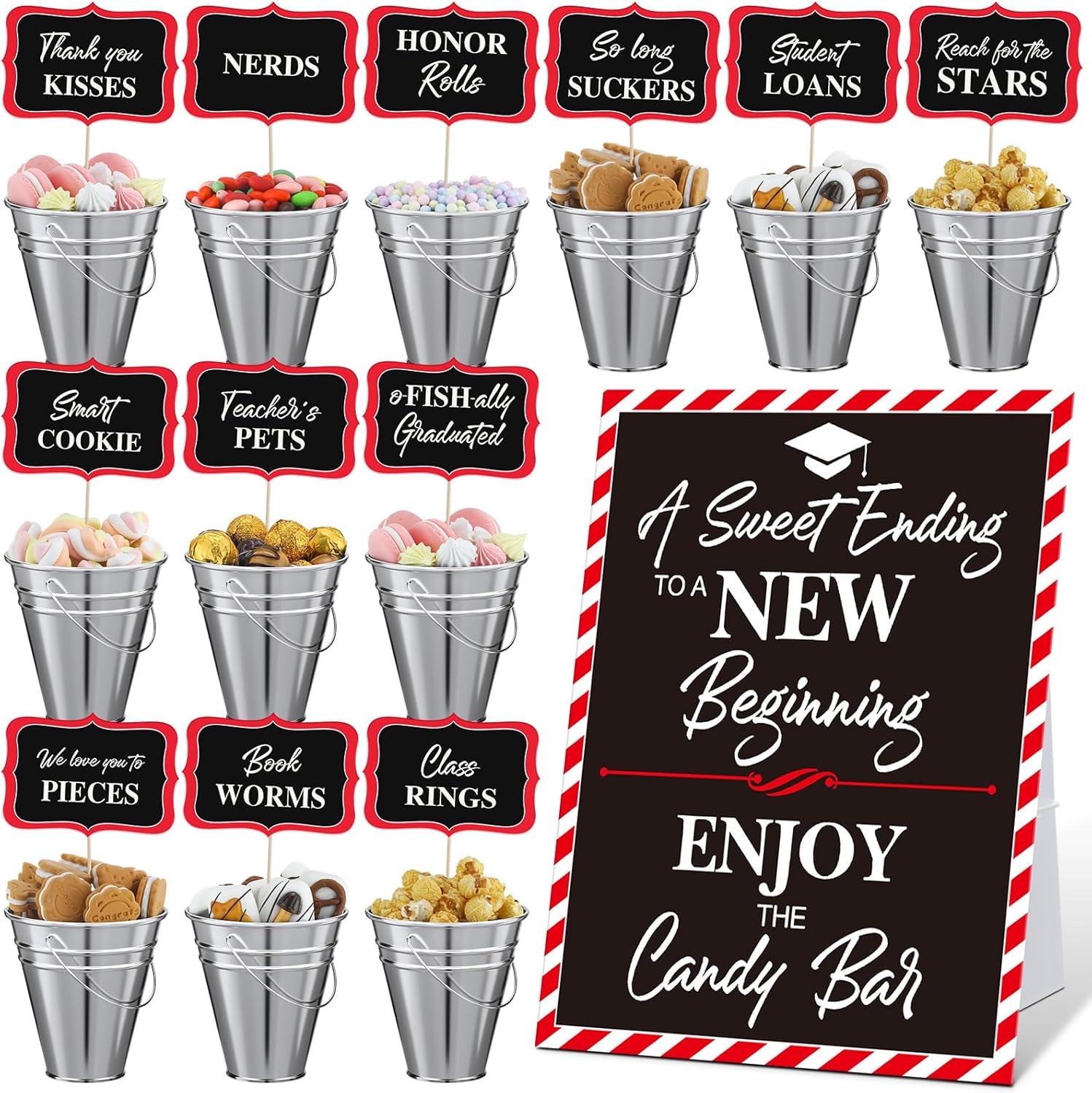 Features: Easy to assemble: These graduation candy bar signs and labels come with a sturdy paper stand, easy to make it stand on your party candy table, and the other 12 food labels each is equipped with a stick. These signs are easy to assemble along with instructions, make you graduation party more fantastic Multi Functional Metal Buckets: The metal buckets for parties are suitable for holding party snacks and candies, and can also be applied as the home decorations and holiday decorations to store and store items around the house craft supplies Specifications: Material: Paper, metal Color: As picture Size: Metal buckets: 5 inches / 12.7 cm x 4.5 inches / 11.4 cm x2.6 inches / 6.6 cm Graduation candy bar sign: 10 x 8 inches Graduation candy bar labels: 6 x 4 inches Package includes: 12 Sets graduation candy table party supplies Notes: Manual measurement, please allow slight errors on size. The color may exist a slight difference due to different screen displays