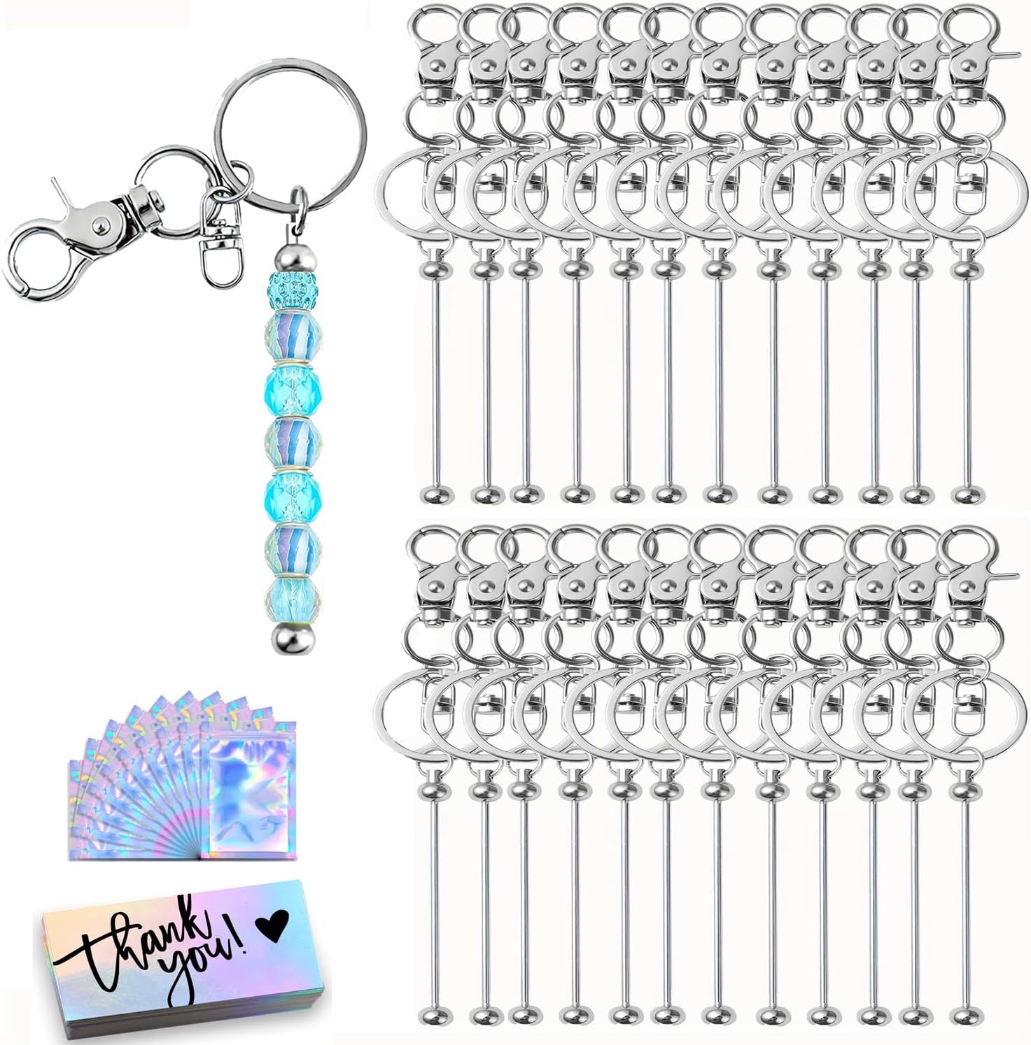 Everything Included: Your Complete Crafting PackageWe believe a great crafting experience lies in the details. That’s why this kit goes above and beyond with everything you need to create, protect, and present:Blank Beadable Metal Keychain Bars: Crafted from high-quality, smooth-finish metal, these sturdy bars are the perfect canvas for your creativity, built to last.Waterproof Resealable Pouch Bags (approx. 3.15" x 5.12" / 8 x 13 cm): Featuring a clear front and silver back, these bags professionally display your creations while keeping them safe from dust and moisture. Perfect for storage or gifting.Thank-You Cards: Add the perfect finishing touch. A handwritten note turns your handmade keychain into a thoughtful, ready-to-give present that shows you care.Simple 3-Step Customization: Design Your Unique Accessory in MinutesPersonalizing is incredibly easy and requires no special tools. Just follow these simple steps:Unscrew: Gently twist off the metal ball at the end of the keychain bar.Slide On: Thread your chosen charms, alphabet beads, or paracord beads onto the smooth rod.Secure: Screw the ball end back on tightly to lock your design in place.Attach your finished piece to keys, backpacks, wallets, or zipper pulls for an instant style upgrade.Endless Possibilities: More Than Just a KeychainDiscover the versatile uses for this multifaceted kit:The Perfect Handmade Gift: Ideal for birthdays, holidays, graduations, and anniversaries. A custom-made gift carries infinitely more meaning than a store-bought item.Hit for Events & Parties: A wonderful activity for craft nights, birthday party favors, classroom projects, or team-building events. Everyone loves creating something they can keep.Practical Organization Tool: The included waterproof resealable bags are incredibly useful for storing jewelry, travel-sized toiletries, first-aid supplies, electronics accessories, and craft components, helping you stay organized.
