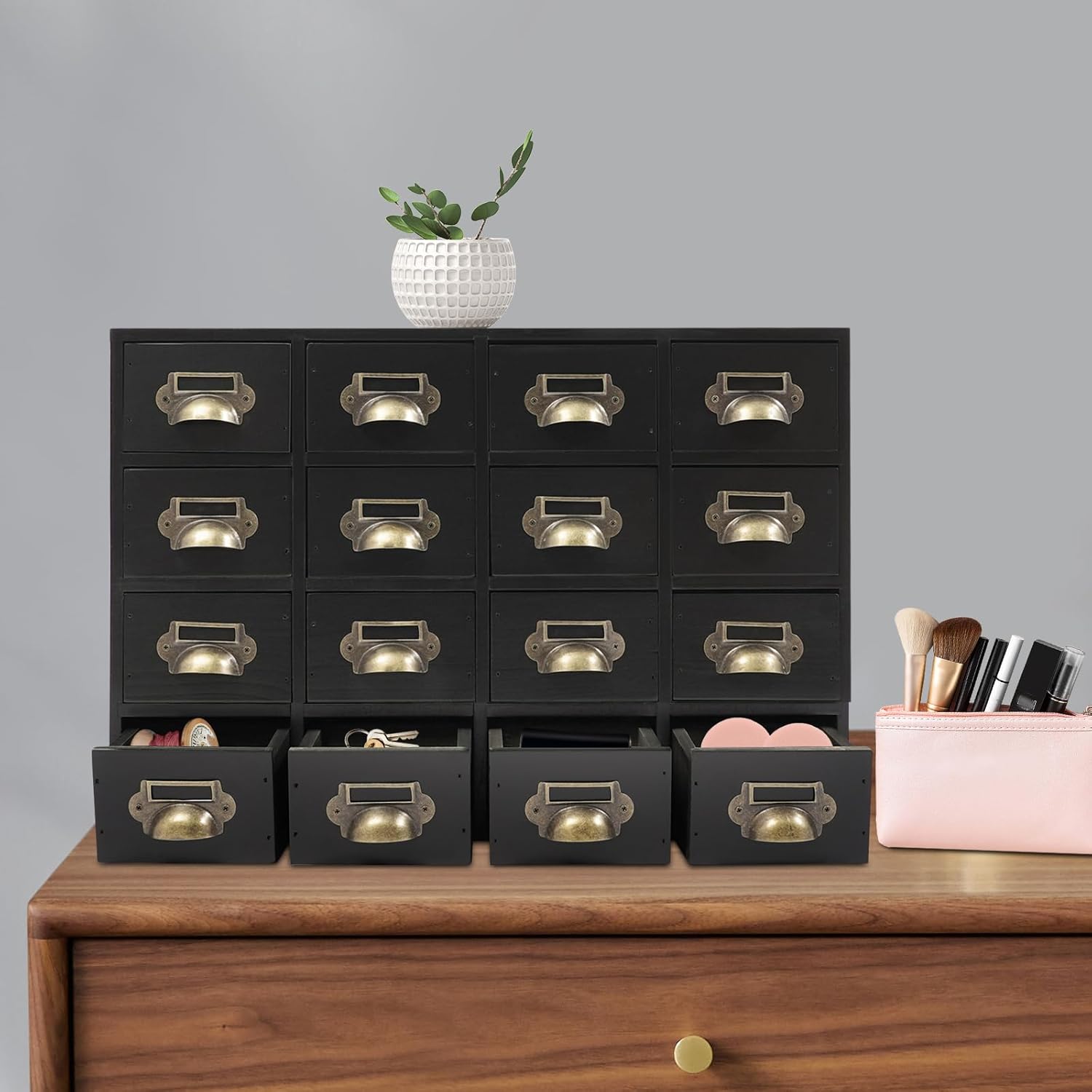 DescriptionTransform your space with this beautifully crafted apothecary cabinet featuring 16 individual drawers, perfect for organizing small items in style. Each drawer comes with a classic metal handle and label slot, making it easy to categorize and locate your treasures. Measuring 19.69 x 13.78 x 3.94 inches, It's ideal for storing herbs, tea collections, crafting supplies, or office essentials. The traditional library card catalog design adds a nostalgic touch while providing practical storage solutions. The wooden construction ensures durability, while the multiple compartments help keep your items neatly separated and easily accessible. Whether used in your study, kitchen, or craft room, this cabinet combines vintage charm with modern functionality. SpecificationColor: BlueShape: RectangularMaterial: Solid Wood, Plywood, Zinc AlloyProcess: Spray PaintingAssembly Required: NoMounting Type: TabletopNumber of Compartments: 16 Load-bearing Capacity: 10kg/22.05 lbsProduct Size: 50*10*35cm/19.69*3.94*13.78inPackage Size: 52*36*11cm/20.47*14.17*4.33inGross Weight: 3.5kg/7.72 lbsNet Weight: 3.32kg/7.32 lbsApplicationIt is suitable for households, offices, small workshops, traditional Chinese medicine stores, etc. It is used to organize various items such as spices, medicines, jewelry, handicrafts, cosmetics, essential oils, small office supplies, tea bags, lipsticks, and more.Package Included1* 16 Drawer Storage CabinetNotes1. Please check the product size before ordering.2. Please allow the slight color difference caused by the shooting light and the 1-3cm error due to manual measurement, and make sure you do not mind before ordering.