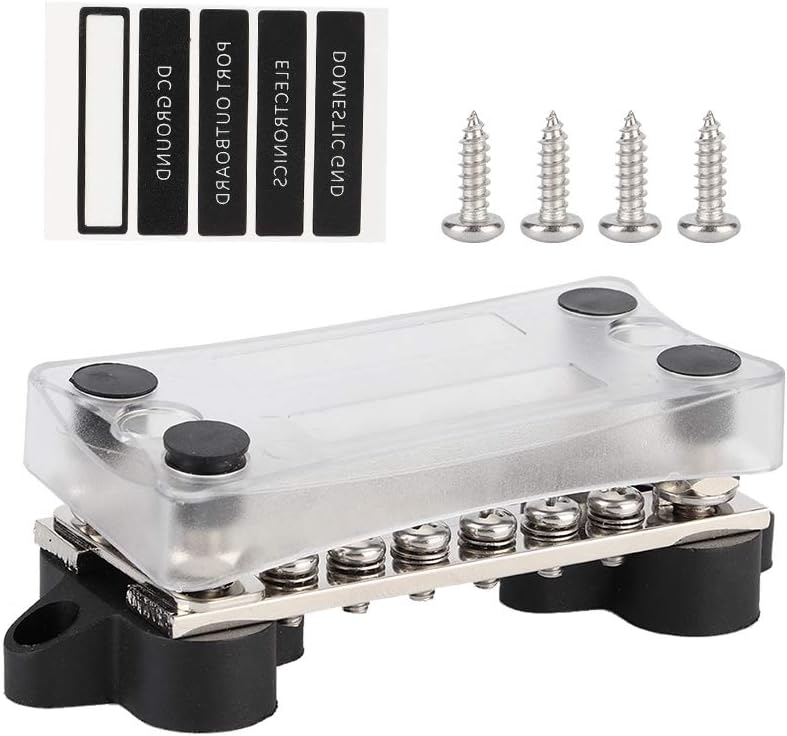 Features:High voltage, high current, large range of use, high safety factor.The base is made of flame retardant plastic to protect your safety.Transparent cover with adhesive slot and sticker for easy identification.Stainless steel screw nut ensures that it does not in the sea.The lower plate is insulated and does not leak when installed on a metal boat / car body.Suitable for car, trucks, motor homes, boats, yachts, etc.Specification:Specifications: 4 x M6(1/4 ) studs, 12 x M4(5/32) screwsRated current: 100AProduct material: Bolt: Tin plated brass, Base: Plastic fire baseSize: 118x46x34mmWeight: Approx. 167gInstructions:Next to M6 is the link to the negative pole, the middle M4 is connected to the negative pole of the device, and the M6 on both ends is connected to the negative pole of the battery.Package list:1 * Bus Bar4 * Screw1 * Sticker