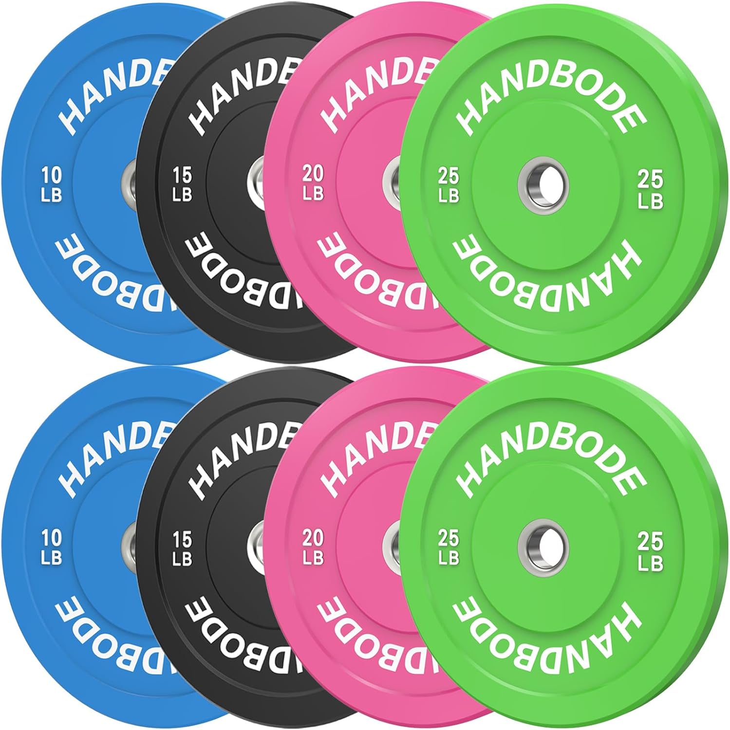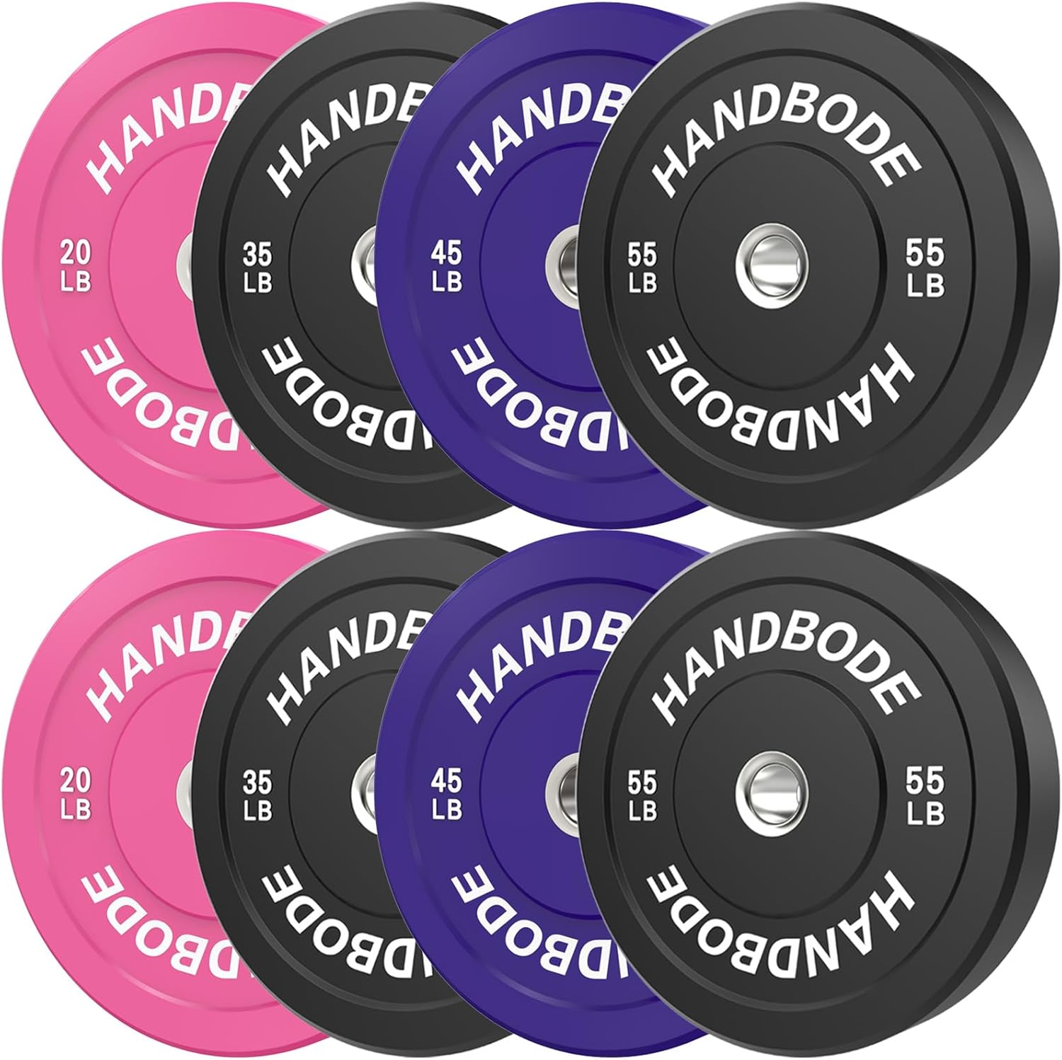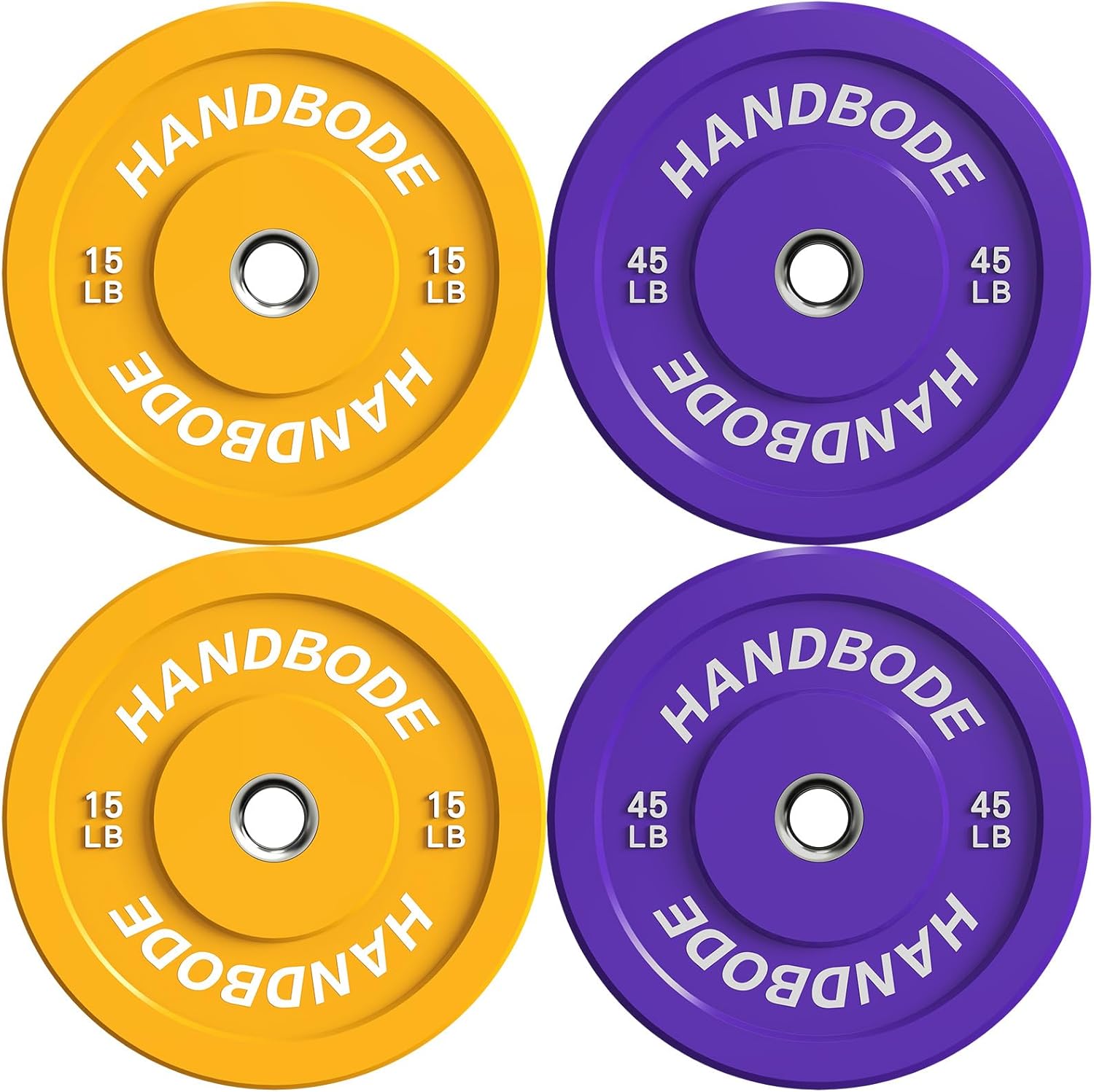 HANDBODE Crumb Bumper Plates Brand : HANDBODE Pounds or Kilograms : Pounds Weight Increments : 10/15/20/25/30/35/40/45/50/55 Plate Diameter : 17.7"/450mm Center Hole Diameter : 2"/50mm Inserts Material : Stainless Steel Plate Material : Crumb Rubber Durometer Rating : 72 ~ 75 Weight Tolerance : 2% Rubber to protect floor or bar Color-coded plate for quick identification Traditional steel plates are noisy and cannot be dropped during intense workouts or Olympic weightlifting sessions. You can drop bumper plates on the floor without damaging the plate, barbell, or floor, because they are constructed with rubber around a central metal hub. Crumb rubber's hardness rating is less than virgin rubber, it is lands softer. The Plates are coor-coded for quick identification and pick up. Crumb bumper plates are made from recycled rubber, making them an environmentally conscious choice. By using recycled materials, these plates help reduce waste and give new life to old rubber tires. If you have a home gym and want to avoid disturbing your family or neighbors, crumb bumper plates are a great choice. Their shock-absorbing properties and reduced noise levels make them ideal for a residential setting, Their ability to withstand drops and provide a bit of bounce is perfect for those explosive movements and dynamic lifts that are the heart and soul of your workout of the day.