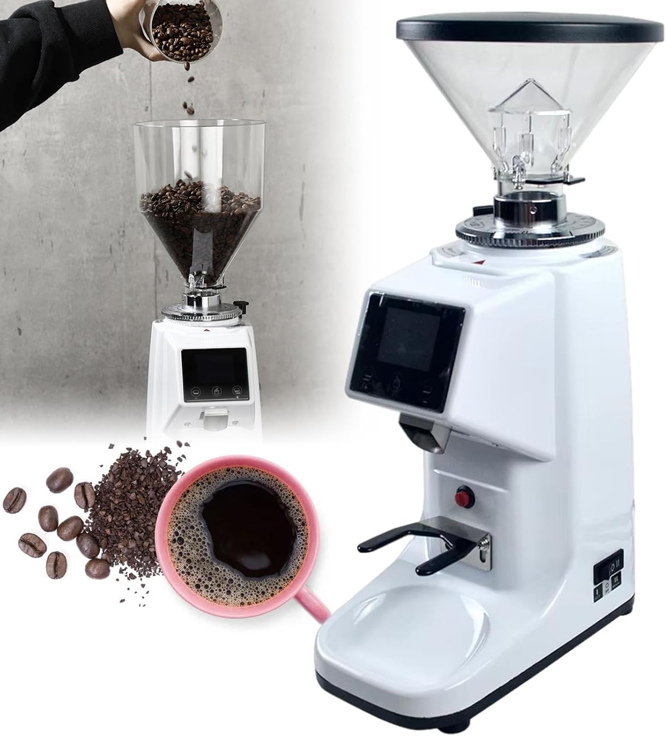 Elevate Your Coffee Experience with Precision & Versatility Electric Coffee Grinder Commercial Coffee Maker & MoreSuitable for home baristas café owners, and espresso lovers, this Electric Coffee Grinder offers professional-grade performance for coffee makers and espresso machines. Designed to meet commercial needs, it's an all-in-one solution for freshness, precision, and durability.Key Features & BenefitsThis coffee grinder offers exceptional functionality with its LCD touch control panel allowing easy navigation of settings including single/double cup modes and 19 grind levels for customization. The 60 mm stainless steel flat burr grinding disc ensures durability, consistent grinding, and minimizes heat to preserve bean aroma. With dual capacity options of 500ml (200g) and 1500ml (500g), it suits both home and commercial use. Its 19 adjustable grind settings cover various brewing methods, and the removable components make cleaning and maintenance a breeze for daily operation. Technical SpecificationsProduct Name: Electric Coffee GrinderPower: 200 WBean Capacity: 500ml (200g) / 1500ml (500g)Body Material: Aluminum AlloyColor Options: Sleek Black or Classic WhiteDimensions: 130 x 230 x 460 mmWeight: 5 kg