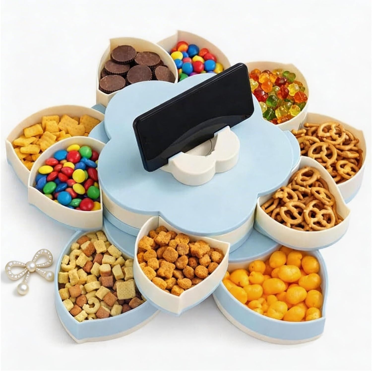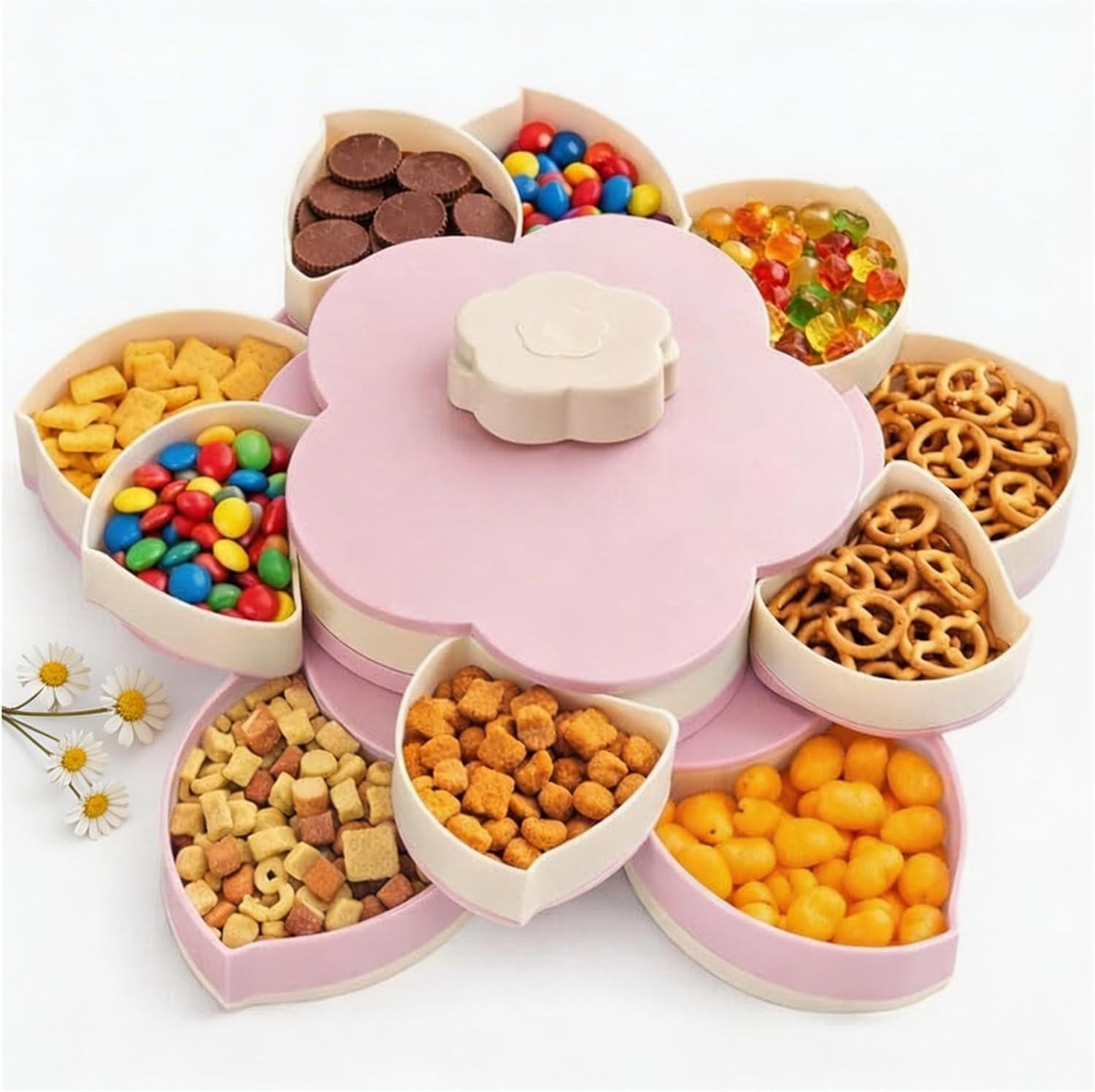 Features:. Clever storage, neat and elegant.. Layered layout, endless creativity.. Stable and non-slip, rotates freely.. Durable materials, easy to clean.. A novel upgrade for snack time.Specifications:Material: plasticWeight: 680/1000gProduct size: 27*8.5cm / 27*14cmColor: Pink,BluePackage Includes:1*Divided Spin and Snack Serving Tray