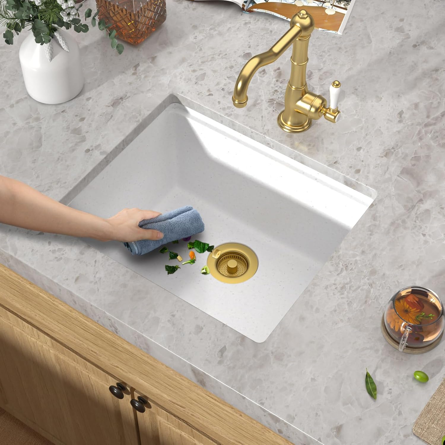 | Included Components | 21x18 Inch White Undermount Bar Sink, Bottom Rinse Grid, Installation Kit, Roll-up Drying Rack, Drain Strainer, Soild Wood Cutting Board, Cabinet Opening Paper |