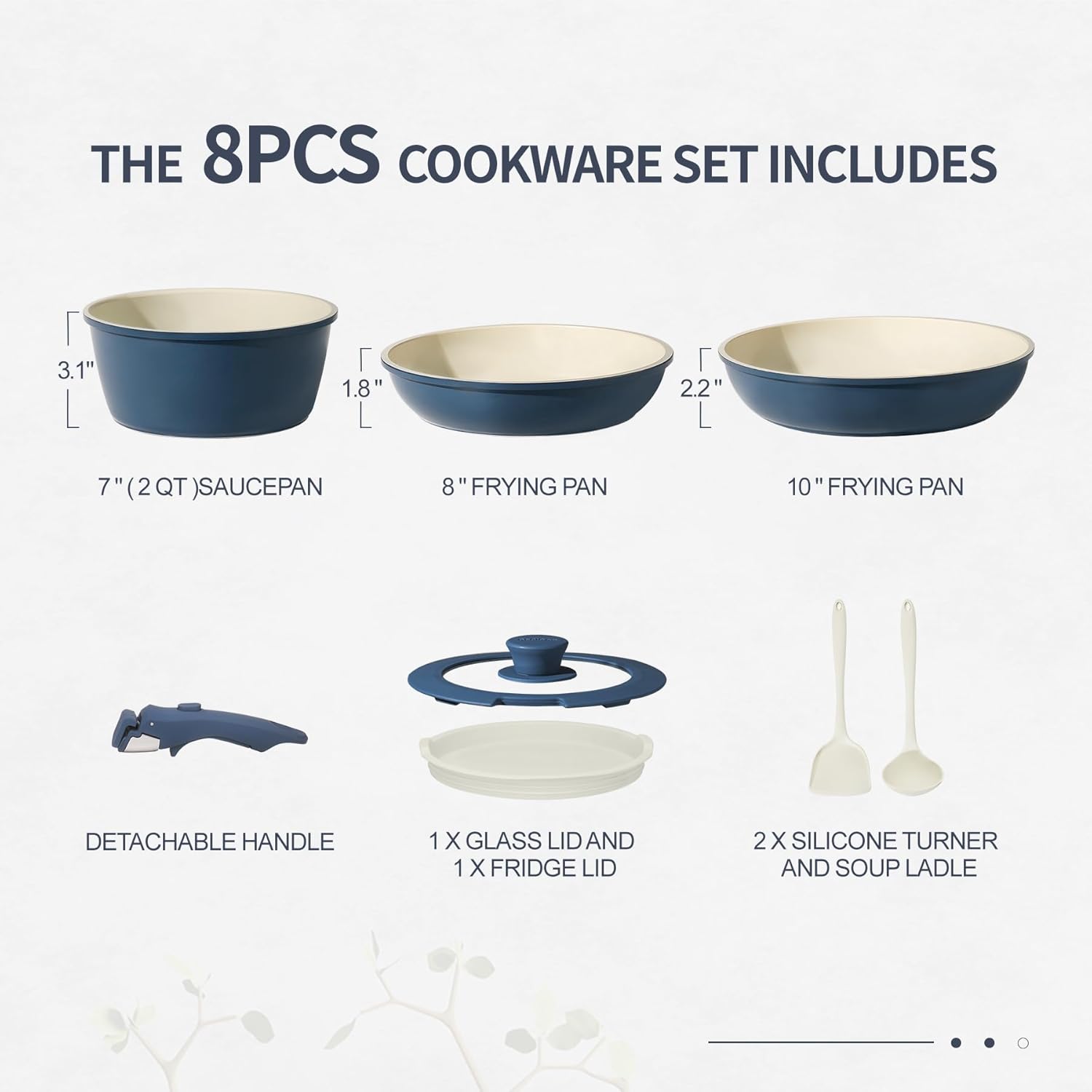 | Included Components | 1.6Qt 7” SaucePan with Fridge Lid, 2.7Qt 10” SautePan with Lid, 1x Tongs,1x silicone turners holder, 1 x scrubbing sponge, 3.6Qt 9.5” Casserole with Lid, 2 x Detachable Handle, 5 x Pot and Pan Protectors, 4 x Silicone Turner and Soup Ladle, 8 Inch 10 Inch Frying Pan , 11 Inch Grill Pan |