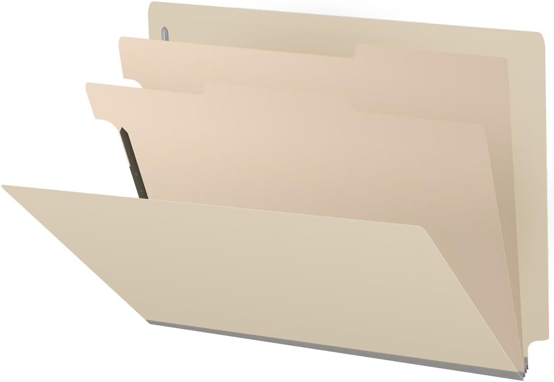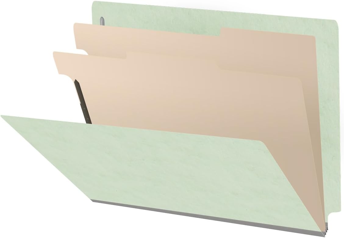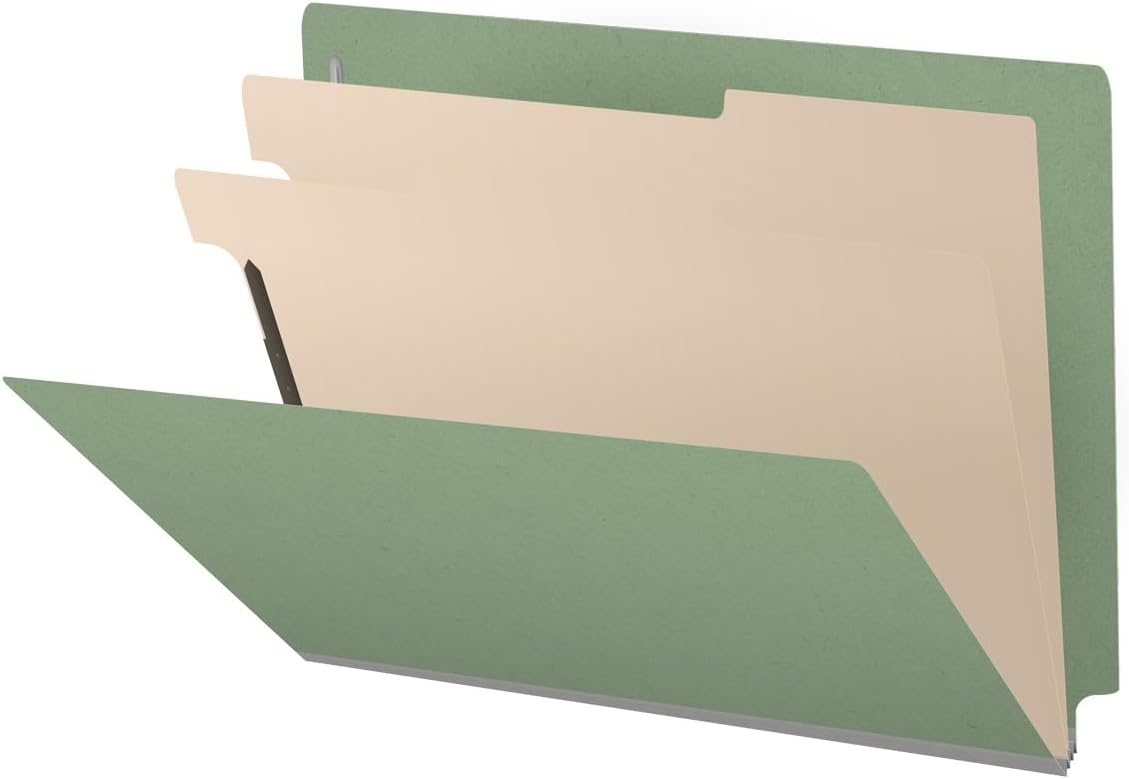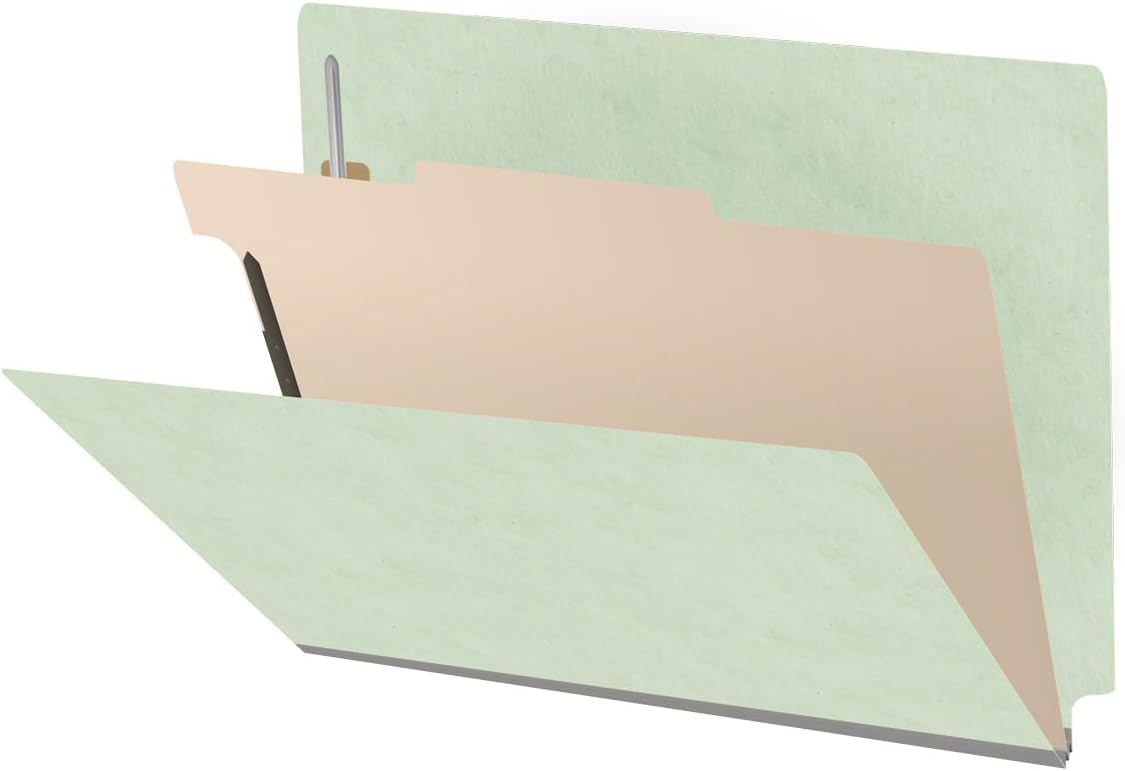 These end tab pressboard classification folders are designed to allow you to divide your documents into multiple sections. THESE FOLDERS WILL NOT FIT IN FILE DRAWERS. These end tab classification folders are designed for filing on shelves. Whether they are active or inactive records, pressboard folders are designed to stand up and last even in the most demanding environment. All pressboard products feature Tyvek expansions which allow the file to expand as needed. These 25 pt moss green pressboard folders also feature two 18 pt manila dividers with two bonded fasteners.