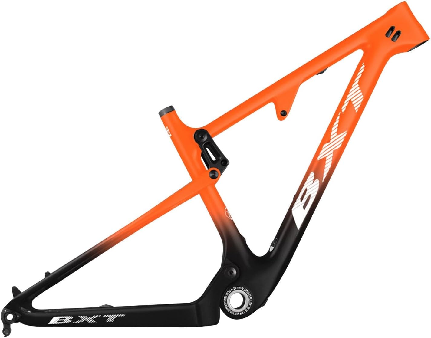 Full suspension mountain bike frame, 29ER Soft tail Disc brake bike frame, 12*148mm Thru-axle BOOST Frame, Perfect gift for bike lovers, can be assembled with your friends.Product name: Carbon Fibre Mountain Bikes FrameFor wheel:29" wheelsSize: 16/17/18.5/20inch(S/M/L/XL)Frame Height: S-405mm; M-430mm; L-470mm; XL-520mm.Recommended rider height: S-160-170cm; M-170-180cm; L-180-190cm; XL-Above 190cm.Maximum tire width: 29*2.35"Level: XC/Trail/RaceMaterial: Carbon Fibre T700+T800Weight: about 2100±50gColor: Matte Black , White , Orange , Yellow , Gray , Green , Cyan , Dark Green , Silver , Red , Blue-1 , Violet , Brown , Pink , Blue-2Specifications: Headset: 41.8*52mmSeatpost: 31.6mmSeatpost Clamp: 34.9mmRear wheel travel: 100mmRear Axle Spacing: 12*148mm Thru-axleShock absorber: Supports 165mm Shock absorberBushing: 22-22mmBottom Brackets: BSA BB73mmBrake: Disc Brake, Directly mounted with 160mm disc brake rotor.Cable : Full internal routing Package: ( NOTES: Shock absorber not included. )Frame + Rear Thru axle lever + Seatpost Clamp + tail hookNOTES: Please check if the bike frame size is correct before purchasing.Service: If you have any product and service questions, please contact us and we will respond to you within 24 hours.