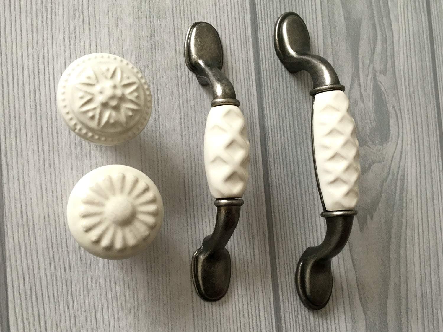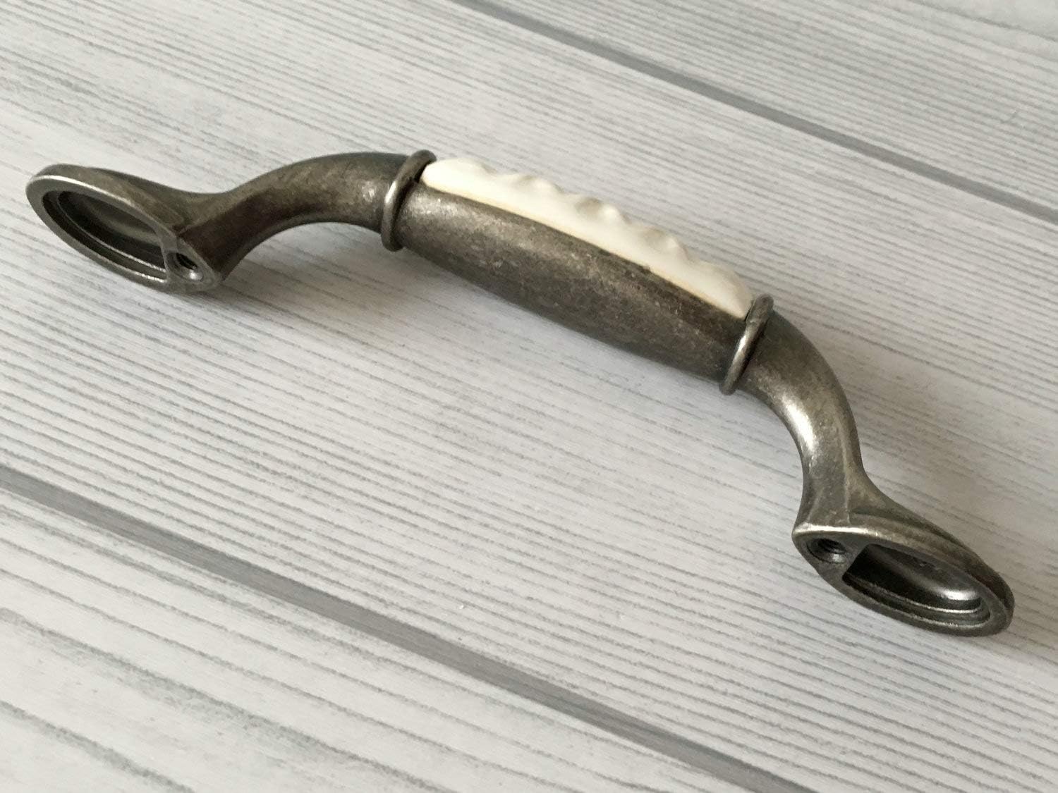Drawer Handles3" C-C Natural White Drawer Pull Dresser Handle Antique Pewter Cabinet Door Pull Handles Kitchen Hardware 76 mm CentersMaterial: zinc alloy Color: natural white, not pure paper white / antique pewterMeasurements: Length:4.9" (125 mm) Width: 0.8" (20 mm)Holes Center to Center: 3" (76 mm) When installed the knob sticks out 1.2" (30 mm) 2 screws included. 1" (25 mm) long.Please advise the thickness of your drawer front, I will send you appropriate screws.