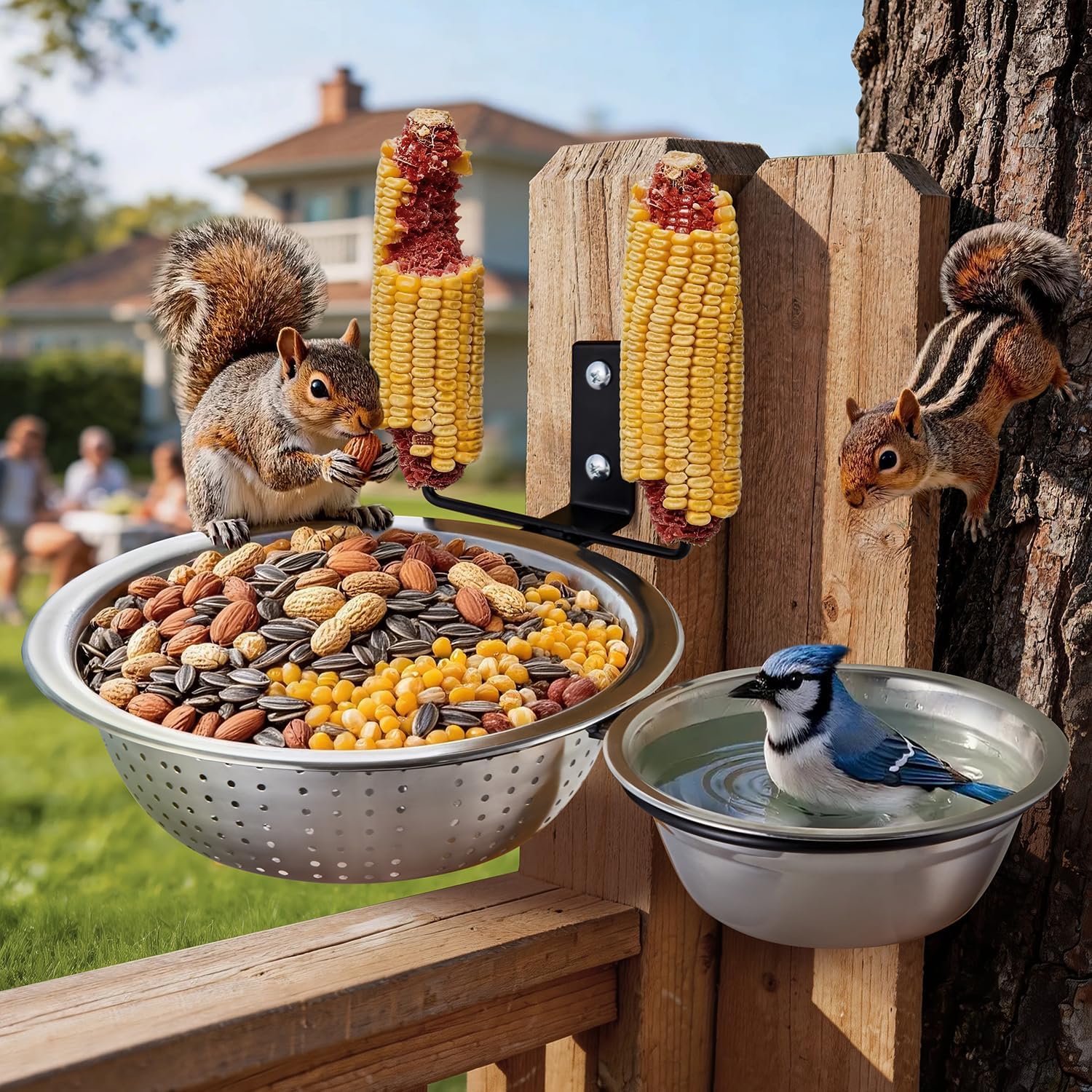 Triple-Basin System: Separate Hydration and DiningSummer weather presents a double challenge for backyard wildlife: intense heat and food spoilage.Traditional feeders fall short. Our upgraded 3-basin system is the answer. The center of this station is a 8.5-inch large-capacity feeding basin, flanqued by two 5.5 inch independent solid water bowls. It provides abundant, reliable drinking water that animals can access separately, which help creat a harmony environment between human and crittersStop Soggy Seeds: Perforated Basin AdvantageTraditional solid basins trap rainwater, leading to spoilage. Our metal squirrel feeder features drainage holes that guarantee rapid water runoff and continuous air circulation. This keeps nuts, seeds, and bird mixes dry, crisp, and clean, which is critical for keeping fresh and supporting the well-being of the squirrels and birds you love.Smart "Squirrel Diversion" - Dual ForksOur station includes two integrated corn on the cob or fruit skewers. Secure a simple corn cob on the fork - a massive distraction. Squirrels will instantly gravitate to the corn cob, leaving the central nut and seed basins less crowded and calmer. This allows smaller birds, timid critters, and multiple visitors to enjoy their meal undisturbed.Hassle-Free Convenience: Removable and Foldable AdvantageCleaning and refilling shouldn't be a messy chore. That's why all three stainless steel basins are completely removable. Furthermore, the heavy-duty mounting bracket features a smart, foldable design. It folds flat against your fence post or tree trunk, allowing it to drastically reduce its profile for easy, compact seasonal storage or when you want to clear your patio space - a truly modern, low-maintenance design.