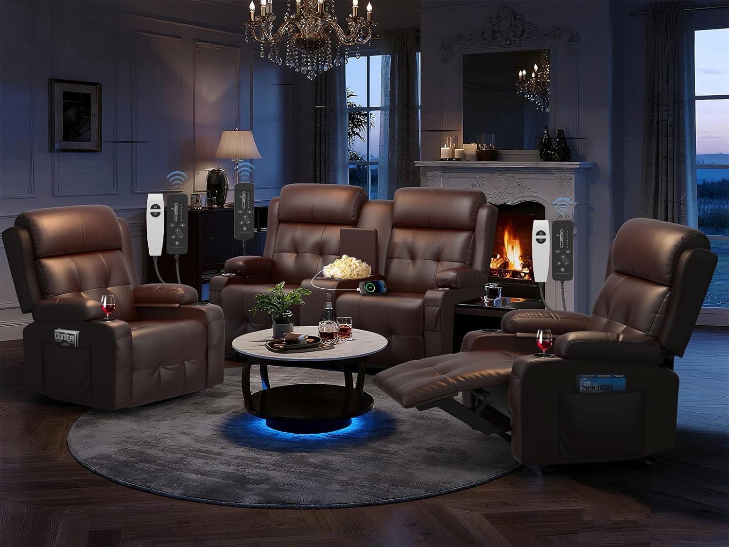 3-Seater Loveseat Recliner Sofa, Home Theater Seating Reclining Couch with Flip Middle Backrest, RV Wall Hugger Sleeper Sofa with Massage, Dawer & Cup Holders, 150° Recline for RV & Living Room