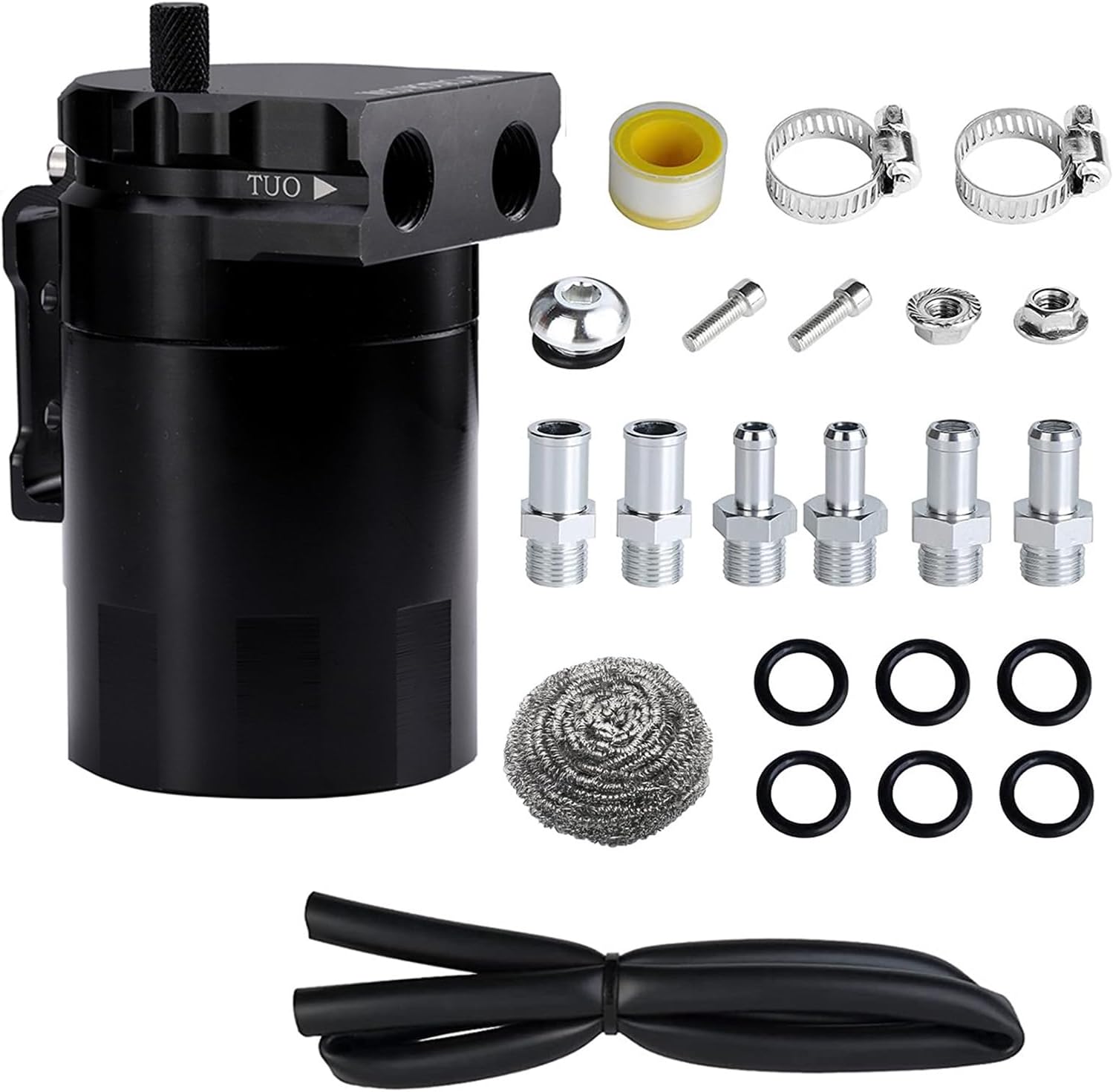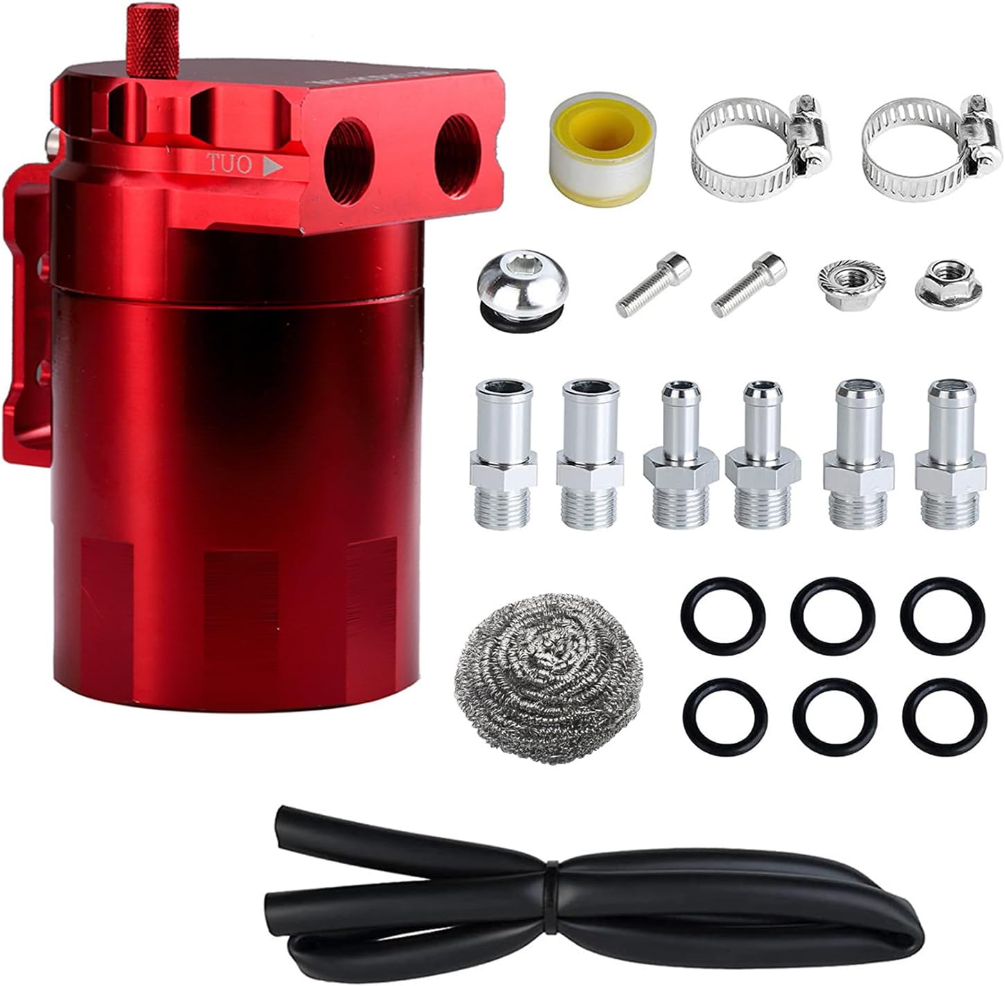 300ml Aluminum Oil Catch Can Set Reservoir Oil Tanks Engine Polish Baffle Car Universally Oil Catch CanFeatures:The oil catch can is to suck the exhaust formed in the crankcase through the pressures in the intake manifold, and inlet to the combustion chamber to participate in the combustion again.The exhaust is mainly smooth of oil vapors and combustible mixture, the oil is viscous. If it enters the intake pipe directly, it may stick to the wall of the intake pipe, which may cause carbon deposits to block the intake. Thus affecting the normal operating of the engine.The oil catch tanks can improve this problem to protect the engine and extend the life of the engine.Keep the engine smoothlyoperating even under severe driving conditions;Locking can prevents dusts and engine oil from entering the engine from the air intake systems;Specifications:Component:AluminumColor:Black,Blue,Redness,SilverType:with Air Filter,Not Air FilterCapacity:300mlPackage Includes:1Set Oil Catch CanNote:Please allow 1mm errors due to manual measurement. Due to the differences between different monitors, the picture may not reflect the actual color of the item.