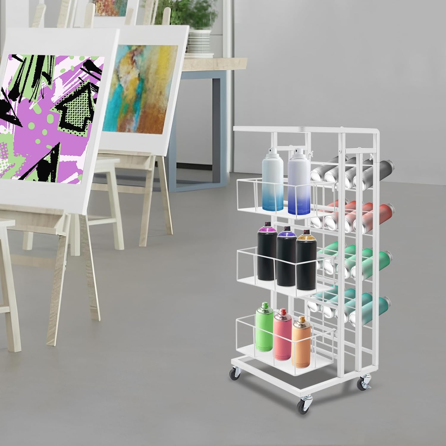Description: Are you bothered by too many spray paint cans cluttering up your art studio? Take a look at our spray paint can organization storage rack. It is made of selected materials and exquisite craftsmanship, and can be used for a long time. Its large capacity makes it convenient to organize your spray paint cans, and the three baskets offer more space if you want to put other things in to keep your space clean. Key Features: Modern Appearance: The classic white color and smooth lines make it match most styles of studios, adding professionalism and modernity to your workplace. Easy Clean-Up: With its smooth surface and simple structure, you can easily use a soft cloth(not included) to wipe it clean. Details: Top Handle Design: Its top bracket can be used as a comfortable handle for you to move this product conveniently. Practical Hooks: The wide hooks on each basket make it easy to hang or remove the baskets on or from the rack, adding more convenience and stability. Smooth Edges: The burr-free edges and round corners prevent collision hurt and enhance your use experience. Application: This product can be used in art studios, street graffiti, painting shops, garages, workshops, retail stores, kitchens, wine cellars, and other places. It can hold pigment cans, glue cans, paint cans, beers, drink bottles, etc. Specification : Color: White Style: Modern Material: Iron Process: High-temperature Baking Paint Mount Type: Floor Standing Assembly Required: Yes Number of Wheels: 4 Number of Baskets: 3 Each Grid Size: 7.5*7.5cm/3*3in Each Basket Size: 30*17*10.5cm/11.8*6.69*4.13in Product Size: 35*35*87.5cm/13.78*13.78*34.45in Package Size: 80*37*12cm/31.5*14.57*4.72in Gross Weight: 6.50kg/14.33 lbs Net Weight: 6.17kg/13.6 lbs Package Included: 1* Spray Paint Can Storage Rack 4* Wheels 1* English Diagram All Accessories for Assembly Notes: 1.Please check the product's size fits your needs before ordering. Paint cans are not included. 2.Please tighten all screws in the last assembly step to ensure the balance of the paint can storage rack. 3.Please allow the slight color difference caused by the shooting light and 1-3cm error due to manual measurement, and make sure you do not mind before ordering.