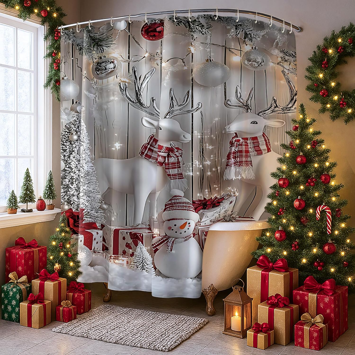 3Pcs Christmas Shower Curtain Set, Red White Deer Bath Mat Rugs Accessories For Holiday Bathroom Decor, Cozy Festive Waterproof Fabric Shower Curtain Set with Hooks