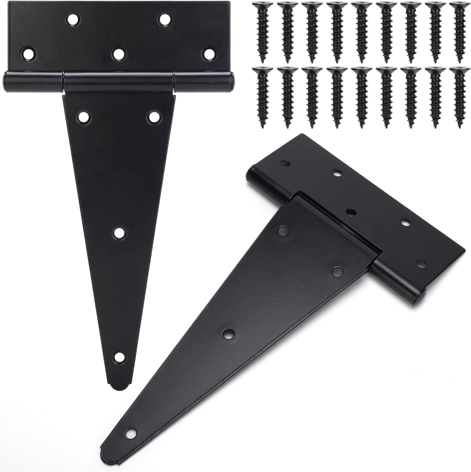4 Inch T-Strap Gate Hinges, Heavy Duty Shed Door Hinges, Black Tee Hinges for Wooden Fences, Yard Gates, Rustproof Wrought Iron Hardware, 6 Pack