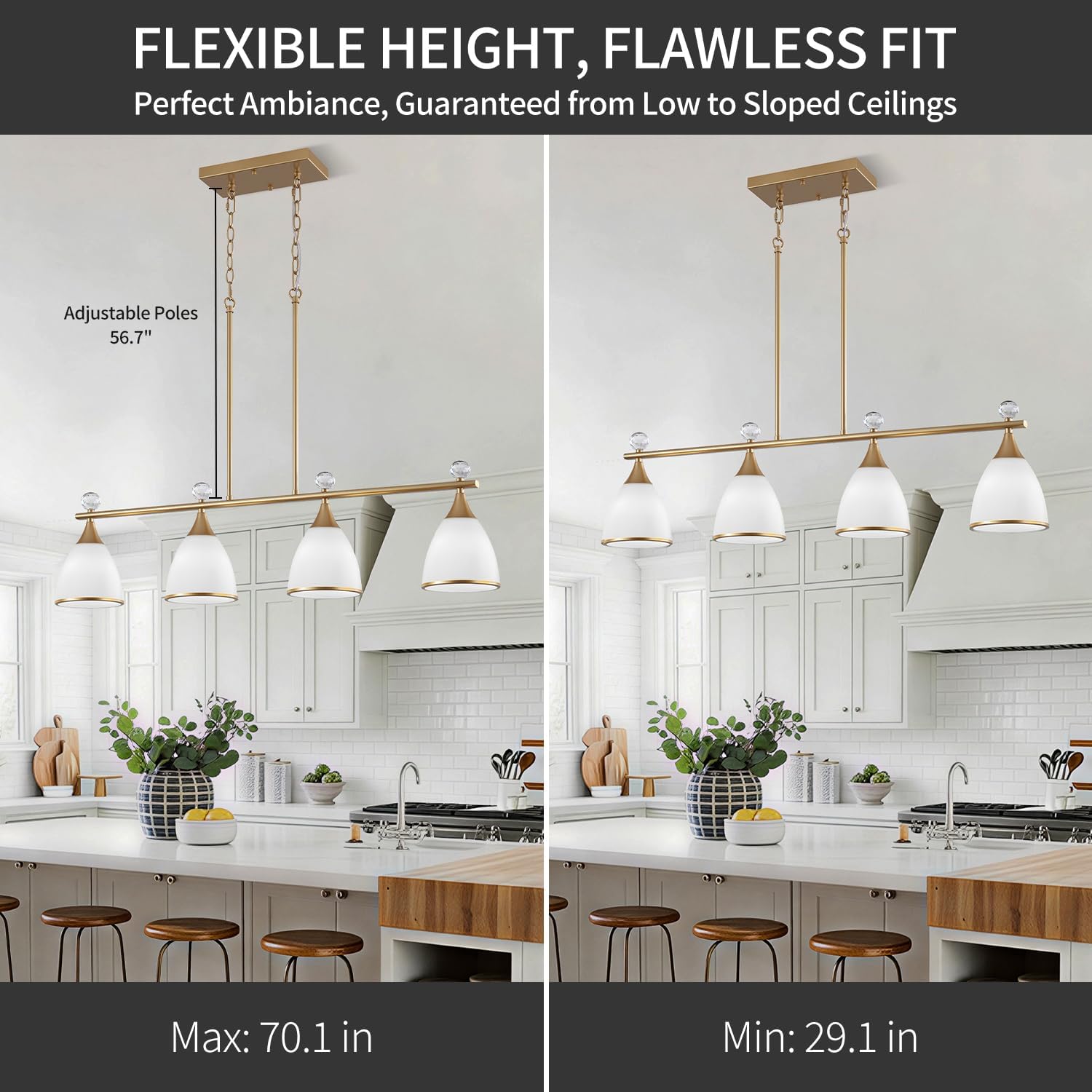 | Other Special Features of the Product | 4-Light, Adjustable Height, E26 Bulb, Elegantly Accented with a Gold Rim and a Crystal Ball, Unique Conical Milky Glass Shades |