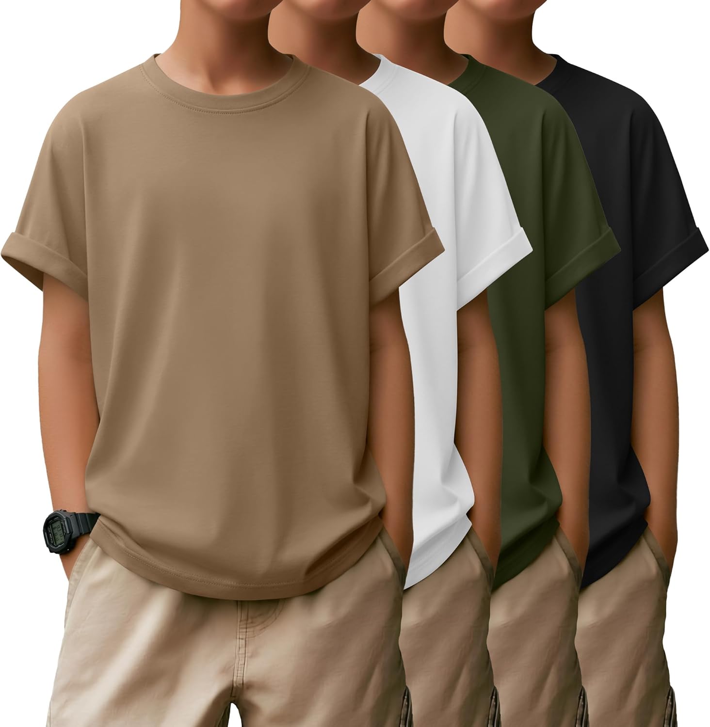 Features: Our boys plain tee shirts feature a simple and versatile design, suitable for all occasions. Whether it's classroom learning, recess activities, after school outdoor exploration, or weekend family gatherings, it blends in effortlessly. The basic design adapts to various settings, helping children navigate everyday life from school to the everyday. Our round neck t shirts for boys are available in a full range of sizes, from 5 to 14 years. To help your little prince find the great and comfortable size, we recommend checking our size chart before ordering. Specifications: Material: 65% Polyester, 30% Cotton, 5% Spandex Package includes: 4 X Boys Short Sleeve Shirts Notes: Manual measurement, please allow slight errors on size. The color may exist a slight difference due to different screen displays