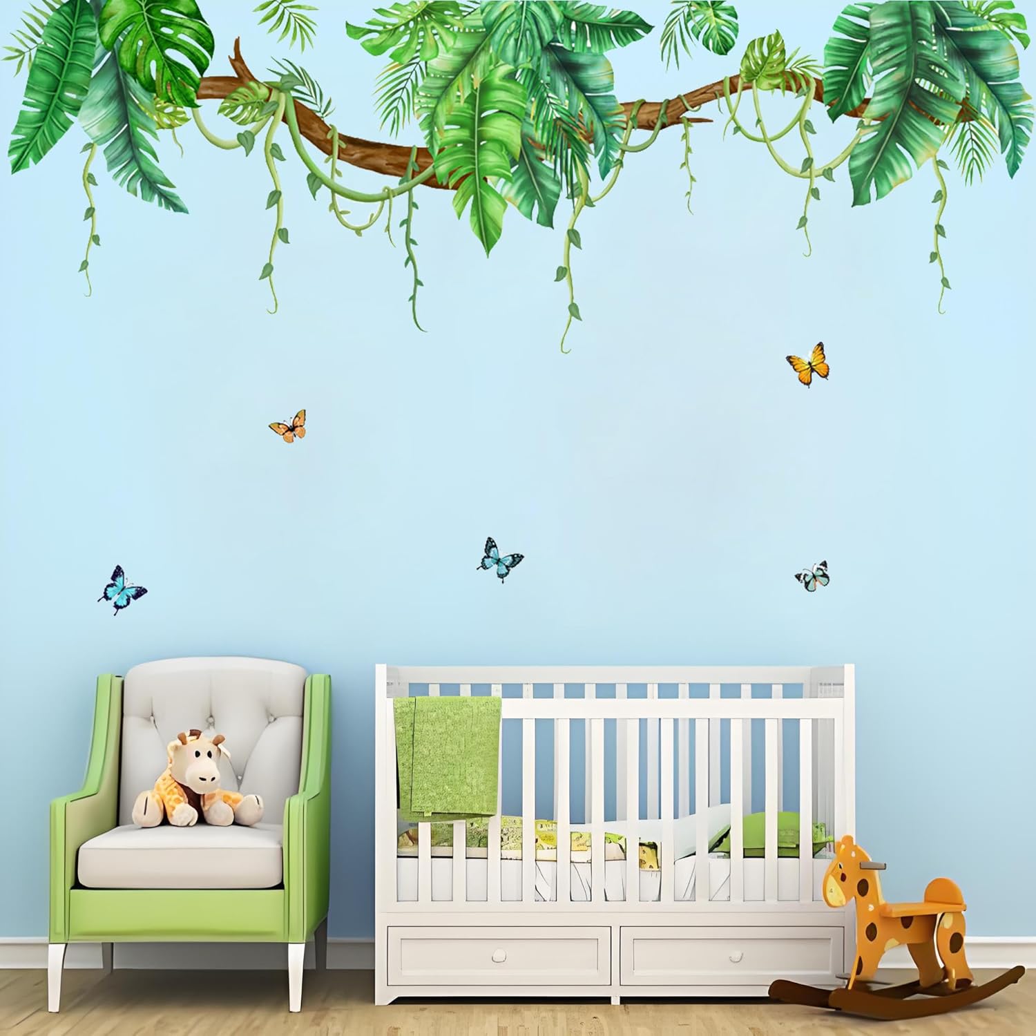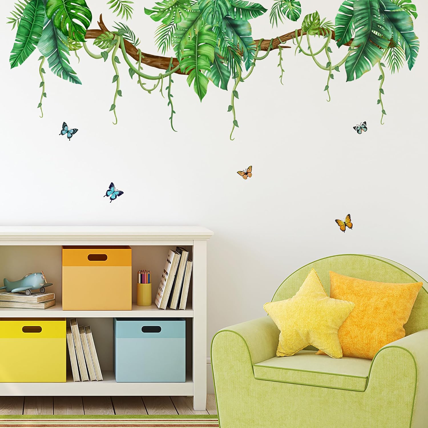 Transform your living space into a tropical paradise with these stunning palm leaf jungle wall decals. The set includes 2 sheets measuring 30x90cm (11.8x35.4 inches) each, creating an impressive display spanning 55.1 inches wide and 48 inches high when arranged. The design features lush green palm leaves, delicate vines, and charming butterflies that appear to flutter across your wall. Perfect for living rooms, bedrooms, or any space needing a touch of nature's beauty. These peel-and-stick decals are easy to apply and position as desired. The realistic botanical artwork includes detailed tropical foliage cascading from brown branches, complemented by blue and orange butterflies that add movement and whimsy to the design. The decals come packaged in one convenient bag, making them easy to store and handle during installation. Whether you're creating an accent wall or adding visual interest to any room, these decals offer a sophisticated way to bring the outdoors inside without the commitment of wallpaper.