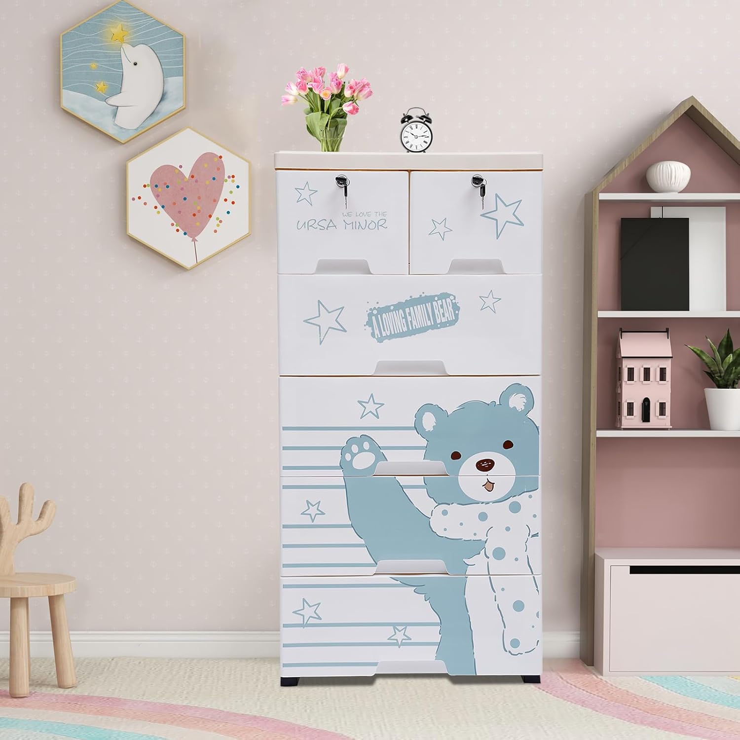 Details👗Drawer Stops: Each drawer has raised stops on both sides to prevent the drawer from slipping out easily.👗Rounded Corners: The corners of our storage cabinet are very rounded and smooth, which can protect you from collisions and is very safe to place in your home.👗Thickened Top Panel: The thickened top has a strong load-bearing capacity, which allows you to put a lot of items on it with peace of mind.👗Recessed Handles: The drawers are designed with recessed handles, which makes it easier to access items and saves surface space. At the same time, the rounded handles protect your hands from scratches and are more aesthetically pleasing.SpecificationColor: White, Gray, Orange, Yellow, Dark BlueMaterial: Food-grade PPShape: RectangularStyle: ModernNumber of Layers: 5Number of Drawers: 6Load-bearing Capacity: 30kg/66lbsProduct Size: 50*35*102cm/19.69*13.78*40.16inchGross Weight: 7.9kg/17.42lbsPackage Size: 51.5*40.5*49cm/20.2*15.9*19.2inchPackage Included6* Drawers6* Drawer Panels1* Top Panel5* Frames16* Panels4* Wheel Covers5* Wheels4* Keys1* ManualNotes1.Please read the manual completely before installation and use, and pay particular attention to the safety instructions included.2.Please allow the slight color difference caused by shooting light and the slight measurement error, and make sure you do not mind before you order.