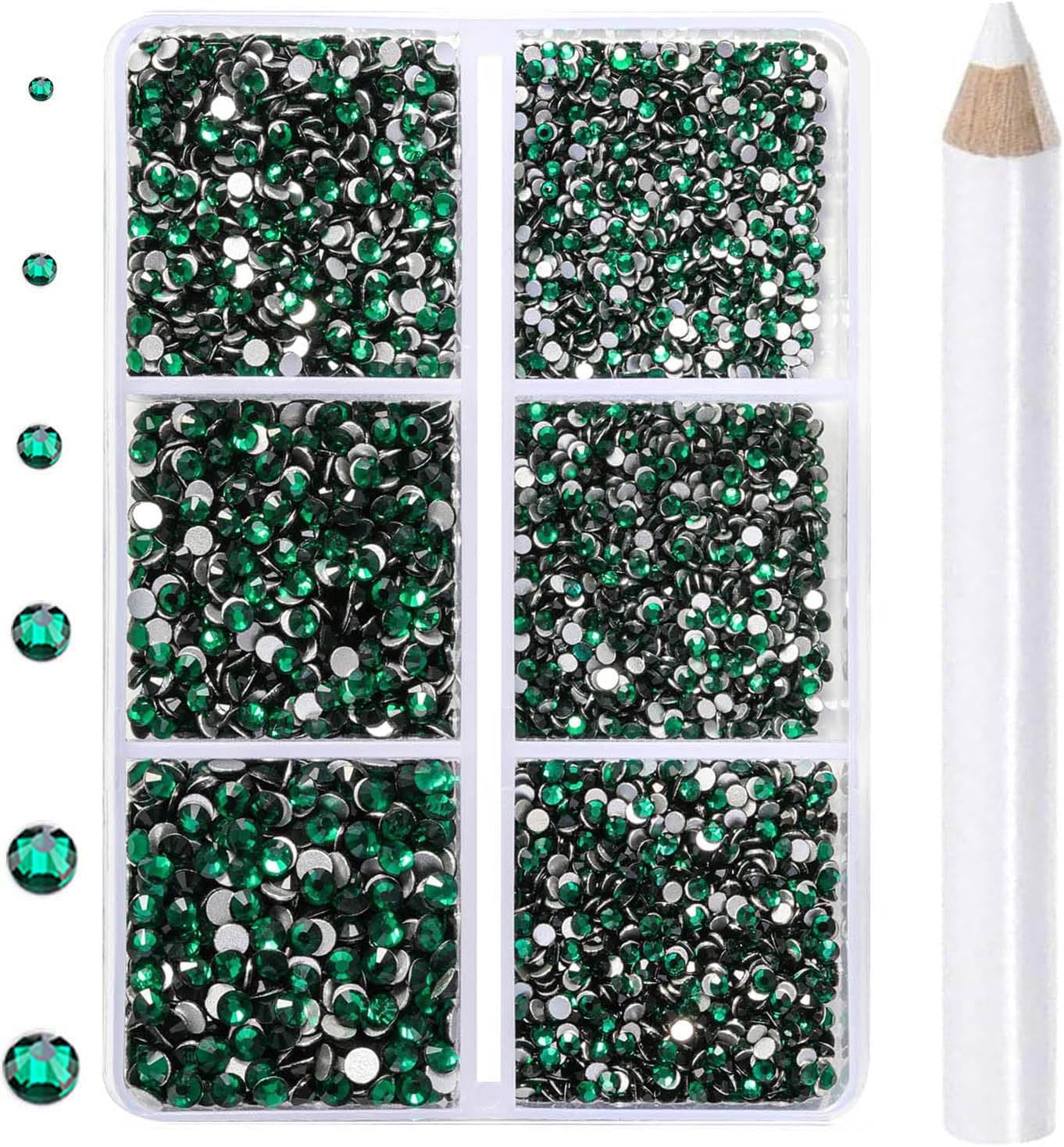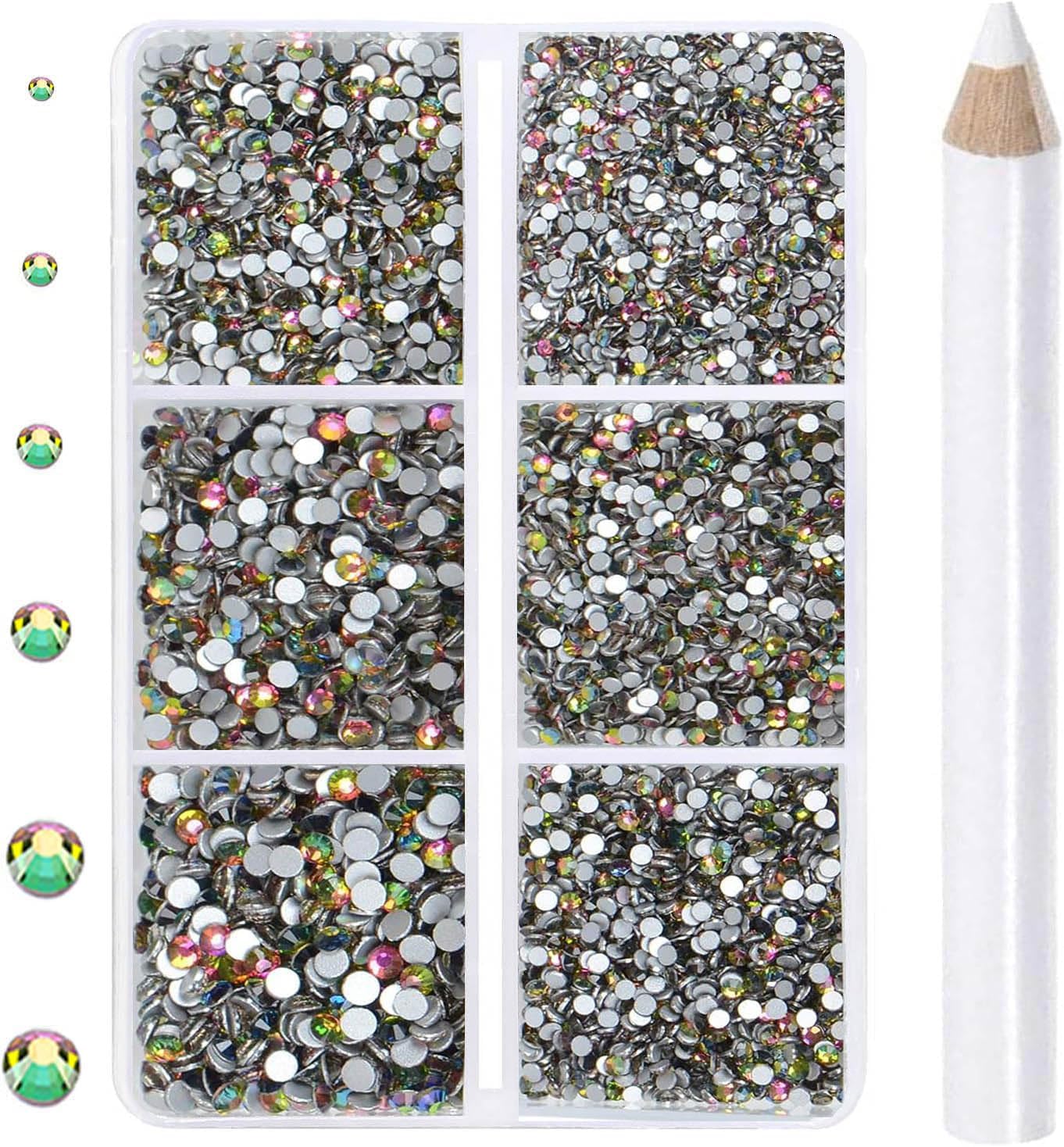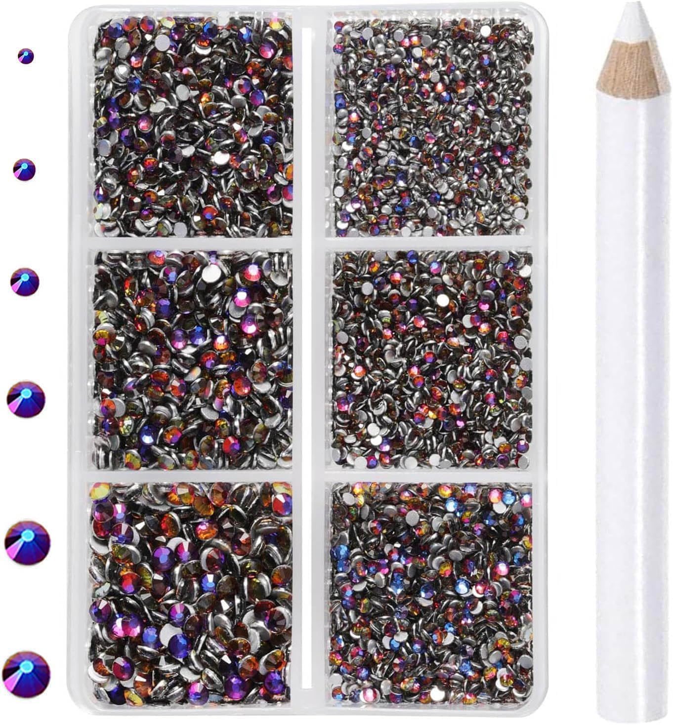 6Sizes rhinestones in one boxes with 6 grids. They are SS4: 1.5mm, SS8: 2.3mm, SS12: 3.0mm, SS16: 3.8mm, SS20:4.8mm and SS30: 6.6mm. Including a large number of large-size rhinestones, enough to succeed a complete clothing and shoes crafts project.