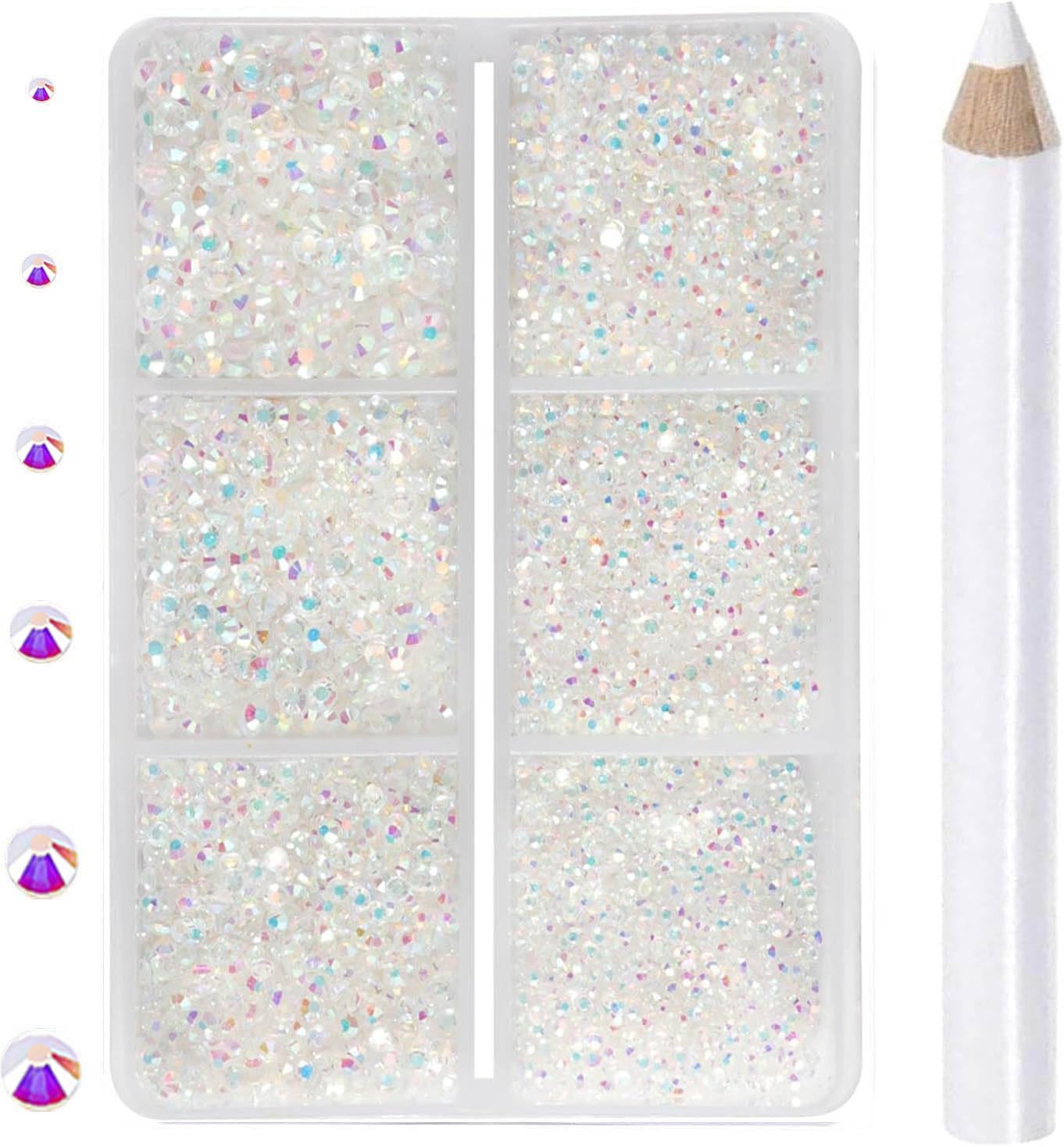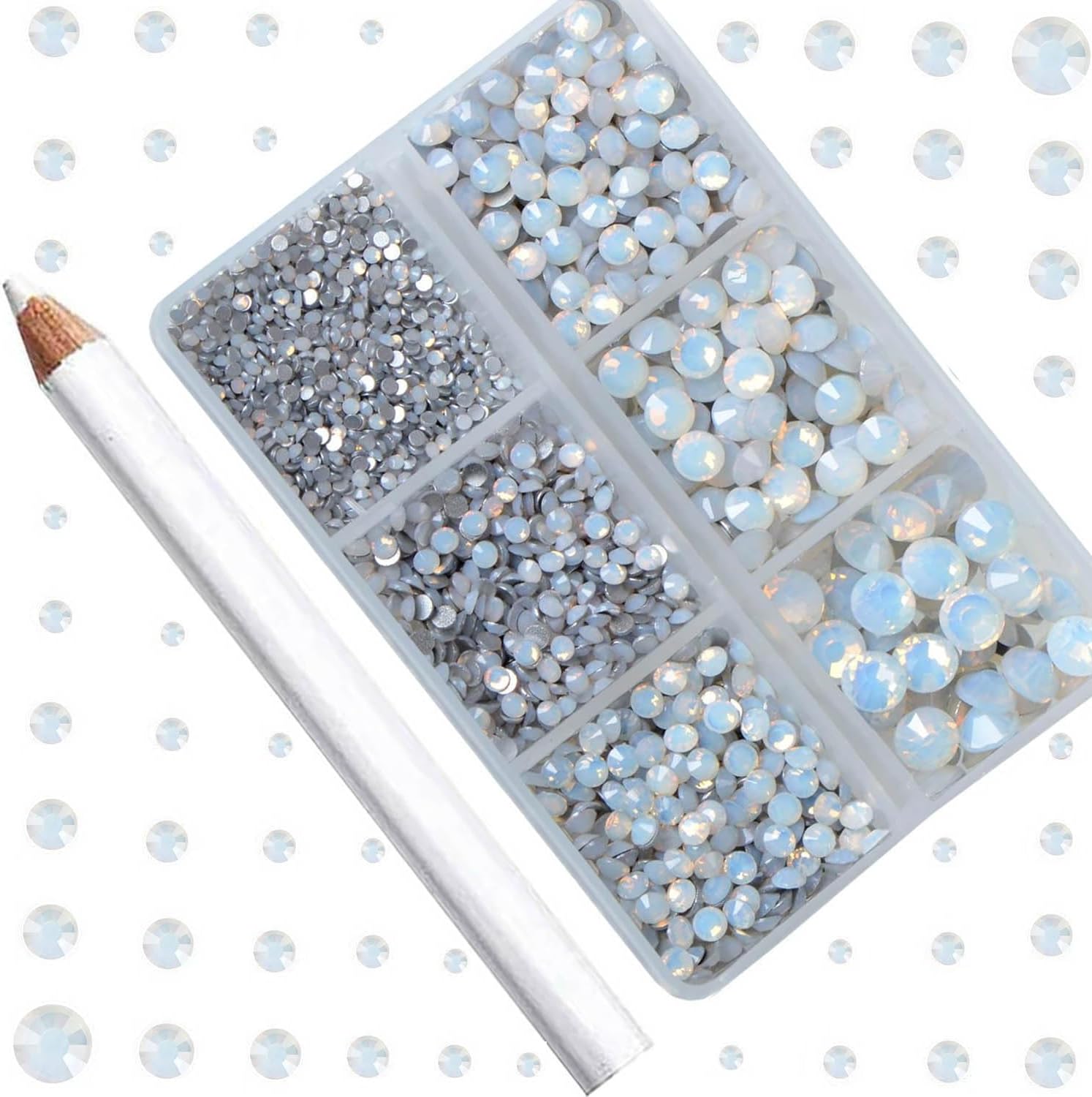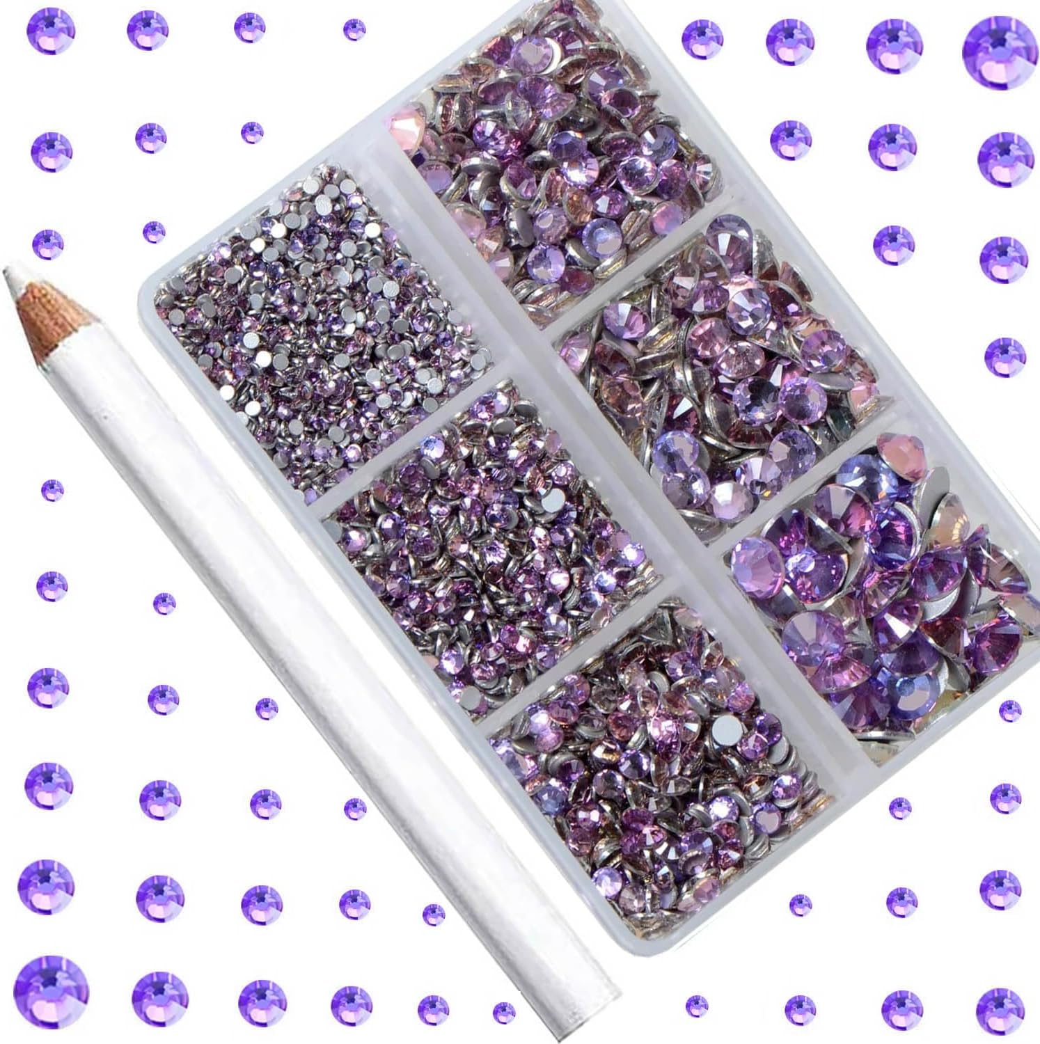 6Sizes rhinestones in one boxes with 6 grids. They are SS4: 1.5mm, SS8: 2.3mm, SS12: 3.0mm, SS16: 3.8mm, SS20:4.8mm and SS30: 6.6mm. Including a large number of large-size rhinestones, enough to succeed a complete clothing and shoes crafts project.