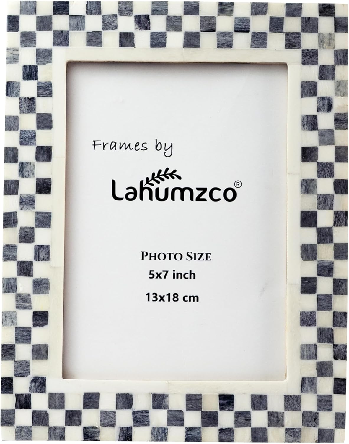 Photo Frames not only Protect Your Memories and Artwork but also Make a Statement on your Side Tables And Walls. This Exclusively Curated Lahumzco Blue White Frame is Available in two Sizes 5x7 And 6x4.You can order both sizes for Desktop Display and Wall Mounting Indoor Decor. IT's Handmade : Lahumzco 5x7 Check Inspired Bone Picture Frame has been Meticulously Inlaid Piece by Piece by Artisans on pine wood Frame and Border Width is 1 inch and Backing Wherein the Pine Wood MDF is provided With Tie. and we Use High quality Glass you can see your Photos or Pictures Extremely Clearly and all Lahumzco Frames Comes with Saw Tooth Hangers On the Back You can also Hang Them On Wall. These Decorative Picture Frame Make a Great Gift for Weddings, Birthday parties, Housewarming Parties, and all Sorts of Occasions. Its Build, Quality, and Design are Extremely Pleasing to the Eye - Everyone will Surely Love to Have one. HANDMADE PRODUCT DISCLAIMER- Please Note That all our Home Décor Products are Meticulously Handmade, Please keep Away From Direct Sun-light or Strong Halogen Lights. The Product May be Cleaned With a Soft Dry Cloth.