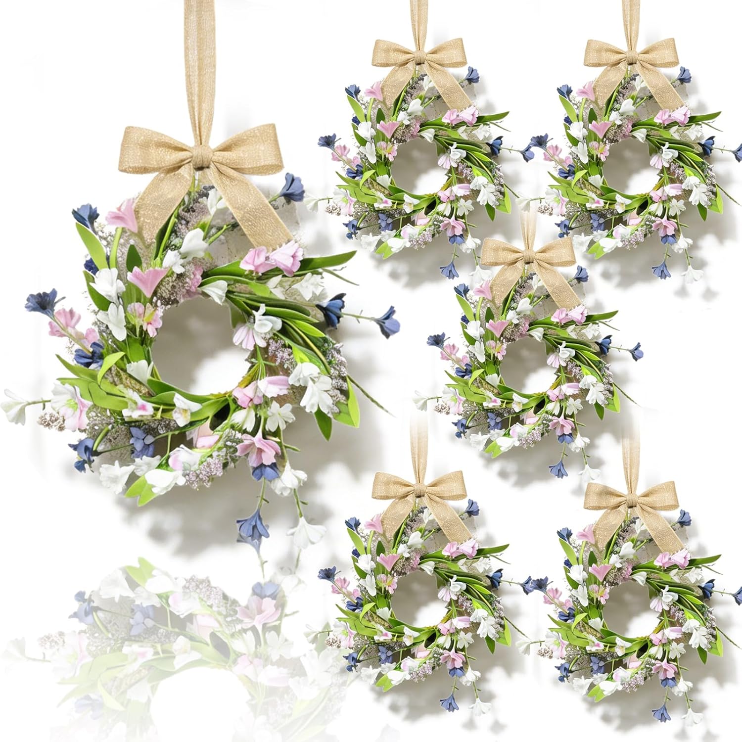 Features: These sunflower-themed artificial candle ring wreath floral decorations with a fresh, bright style—perfect for home decor. The hanging wreath made of yellow sunflowers, small daisies, and green foliage, they can tied with a burlap bow, then hanging on doors or walls. They can use as candle centerpiece, making it a great tabletop accent. Small summer sunflower floral wreaths for cabinets mini floral candle rings makes a thoughtful gift for family, friends, partners, colleagues, or neighbors. It\\\'s a wonderful way to show love and warmth on special occasions like birthdays, engagements, baby showers, Easter, Mother’s Day, or any meaningful event. These summer sunflower candle rings artificial sunflower pillar candle holder ring is crafted from high-quality cloth and plastic, which is not only long-lasting but also upholds the green concept. It does not need regular watering, pruning, or maintenance. The three-dimensional blooms, realistic shapes, and pleasing green color make you feel like you\\\\\\\'re in a natural garden, creating an immersive sensory experience. Whether used for indoor or outdoor candle decoration, it demonstrates high practical value and aesthetic appeal and is ideal for enhancing the style of a space. Specifications: Size: Inner diameter of approximately 3.14-3.54 inches/8-9cm External diameter of approximately 9.84-11.81 inches/25-30cm Package includes: 6 x Sunflower mini wreath 1 x Roll ribbon (16.4ft ) Notes: Manual measurement, please allow slight errors on size. The color may exist a slight difference due to different screen displays.