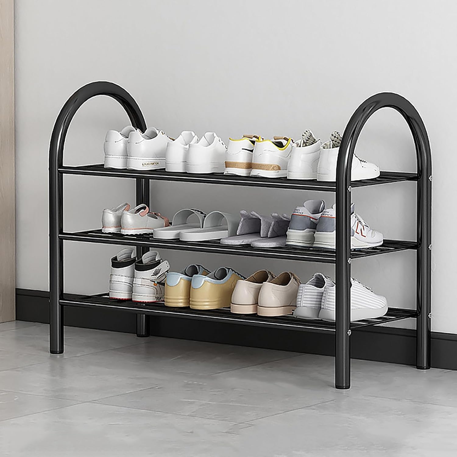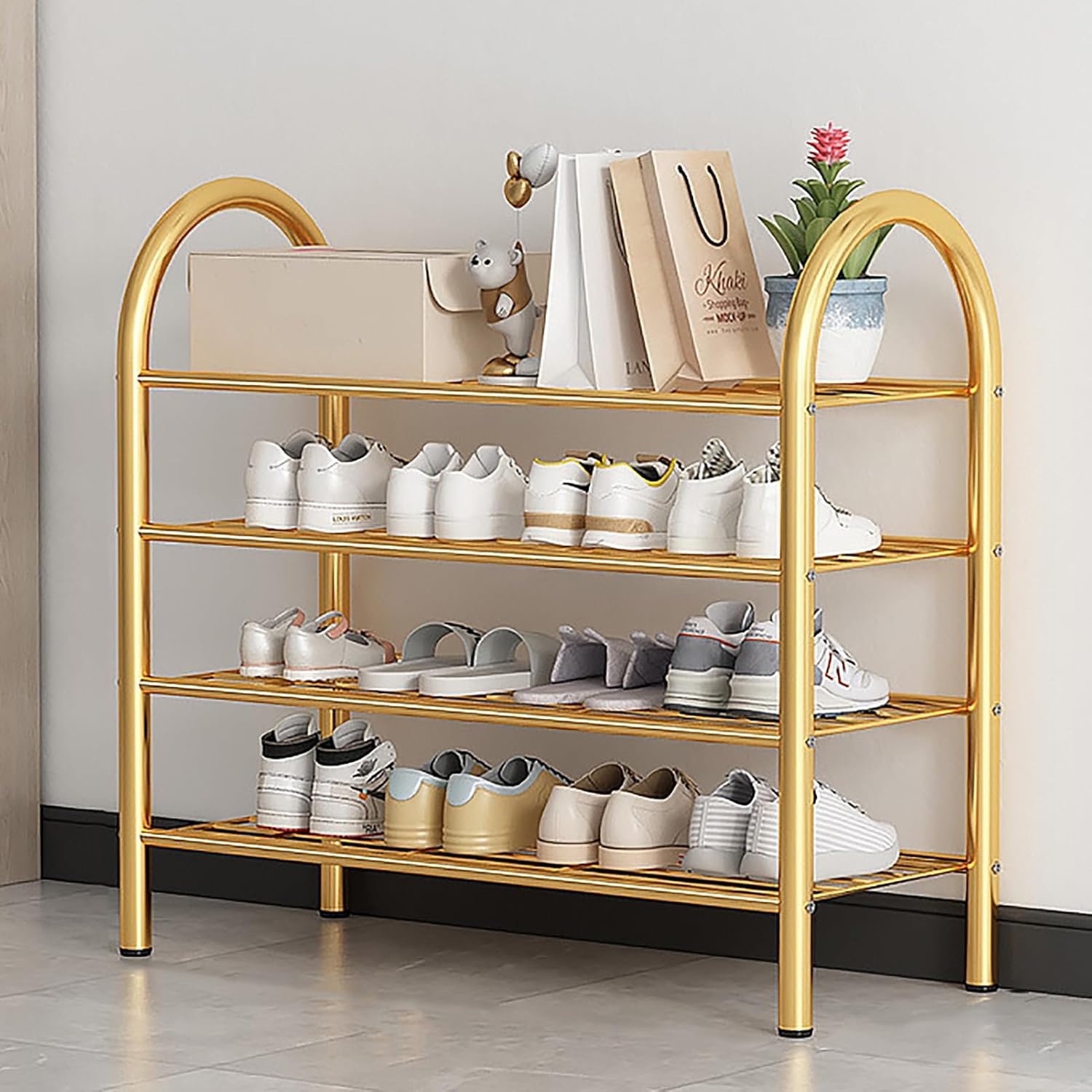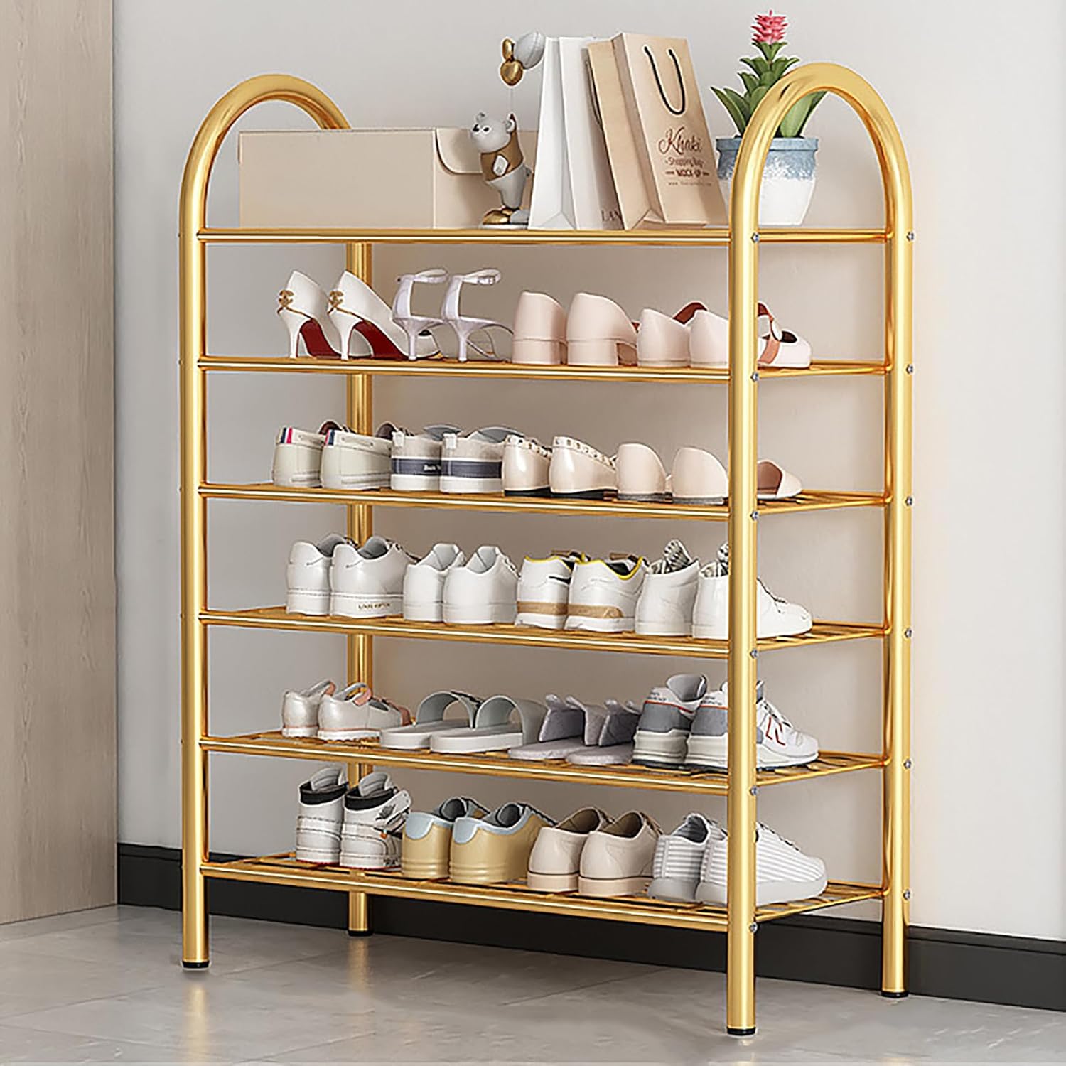 If your home is slowly but surely becoming a mess of shoes, why not organize them in this garage shoe rack?See your whole collection in order, you don't have to take out and dig through your commuting shoes every morning,With the help of this easy to assemble Shoe Rack, you can store sneakers, heels, boots, and dress shoes with ease.It can hold up to 20-30 pairs of shoes on 6 tier shoe racks, creating an organized and tidy way to store your shoes when they're not in use.Stable and durableOur shoe organizer rack is strong and stable, with strong load-bearing capacity and balance, it will not shake or collapse when the shoes are fully loaded,it can make perfect use of the space in your home and make your life more comfortable.Dividable shoe rackYou can assemble and disassemble this floor shoe rack freely according to your home storage needs, upgrade it to a narrow shoe rack, and you can also remove another layer to fit more boots, high heels, bags or other larger accessories.Wide range of usesOur shoe rack can hold not only shoes, but also hats, books, bags, plants and other accessories. This free standing shoe rack organizer can be perfectly placed in the living room, bedroom, hallway, closet, garage, dorm room, entryway and more.Specifications:Color:Gold,BlackMaterial: MetalTier: 3/4/5/6 tierPackage Content:1 x Shoe Rack1 x Package Components1 x Instructions