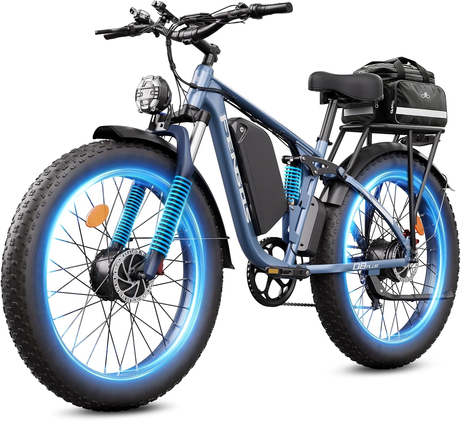 | Additional Features | ①6000W Powerful Quite Brushless Motor; ②40-45 MPH Fast Speed (Can Limit Speed); ③ 100 Miles 60V 1200WH Battery; ④Colorful Informative Display; ⑤5 Speed Mode; ⑥24”X4” All Terrain Fat Tire; ⑦Easy Mount Phone Holder; ⑧Aluminum Frame; ⑨Full Suspension; ⑩Decent Fenders; ⑪7 Speed Professional Gears; ⑫Bright Headlight and Taillight with Turn Signal; ⑬Dual Hydraulic Disc Brakes with Brake Sign; ⑭Dual Motor |