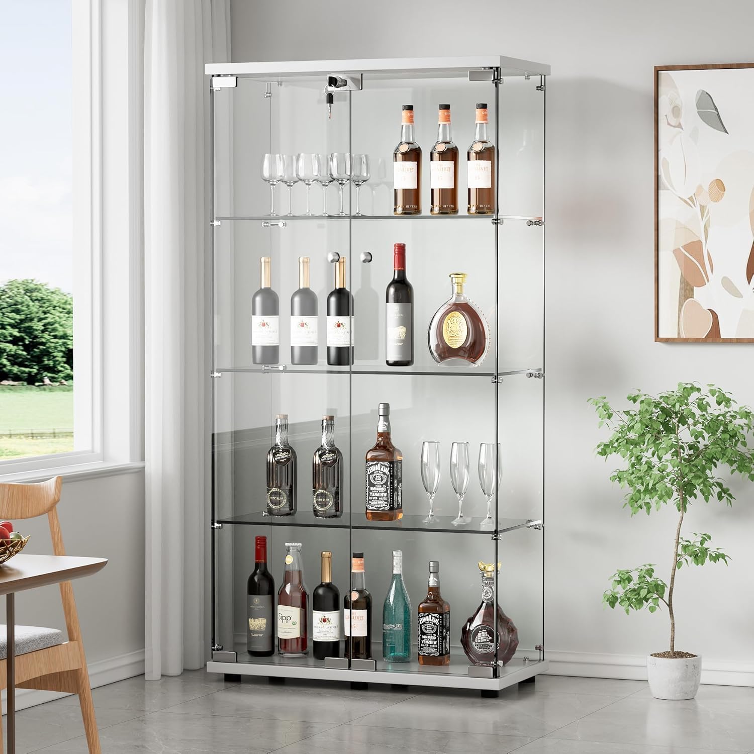 Maotifeys glass curio cabinet is made of tempered glass and features 4-tier shelves, providing plenty of storage space and a safe area to hold all your special collections, leaving your room looking clean and tidy. It is a functional and decorative storage case for your home and office. Main Features 4-Shelf Large Capacity: Overall Dimensions 64.7"H x 16.7"W x 14.3"D. The 4-tier design makes the most of storage space and creates categories for your items. With LED lights: add a colorful ambience to your collectibles, make it look more fantastic. Tempered Glass: High-strength 5mm Thick tempered glass is stronger than regular glass and can not only withstand up to 20 pounds per shelf but also keep your collection safe. Solid Wood Particle Boards: 25 mm MDF board enhances the sturdiness and durability of this cabinet, allowing it to be used for a long time. Functional and Decorative: The simple linear design and clear appearance make it a good and functional showcase, but also fit well into different styles of furniture. Safe and Stable: Equipped with lock and door, which helps keep dust out and well protect your collections. Specifications Overall Item Dimensions: 64.7"H x 16.7"W x 14.3"D Material of the Shelf Top: 5mm Thick Tempered Glass Material of the Top/ Bottom Frame: Medium Density Fiberboard(MDF) Number of Shelves: 4 Number of Doors: 1 Loading Capacity: 440lbs Overall Item Weight: 77 lbs