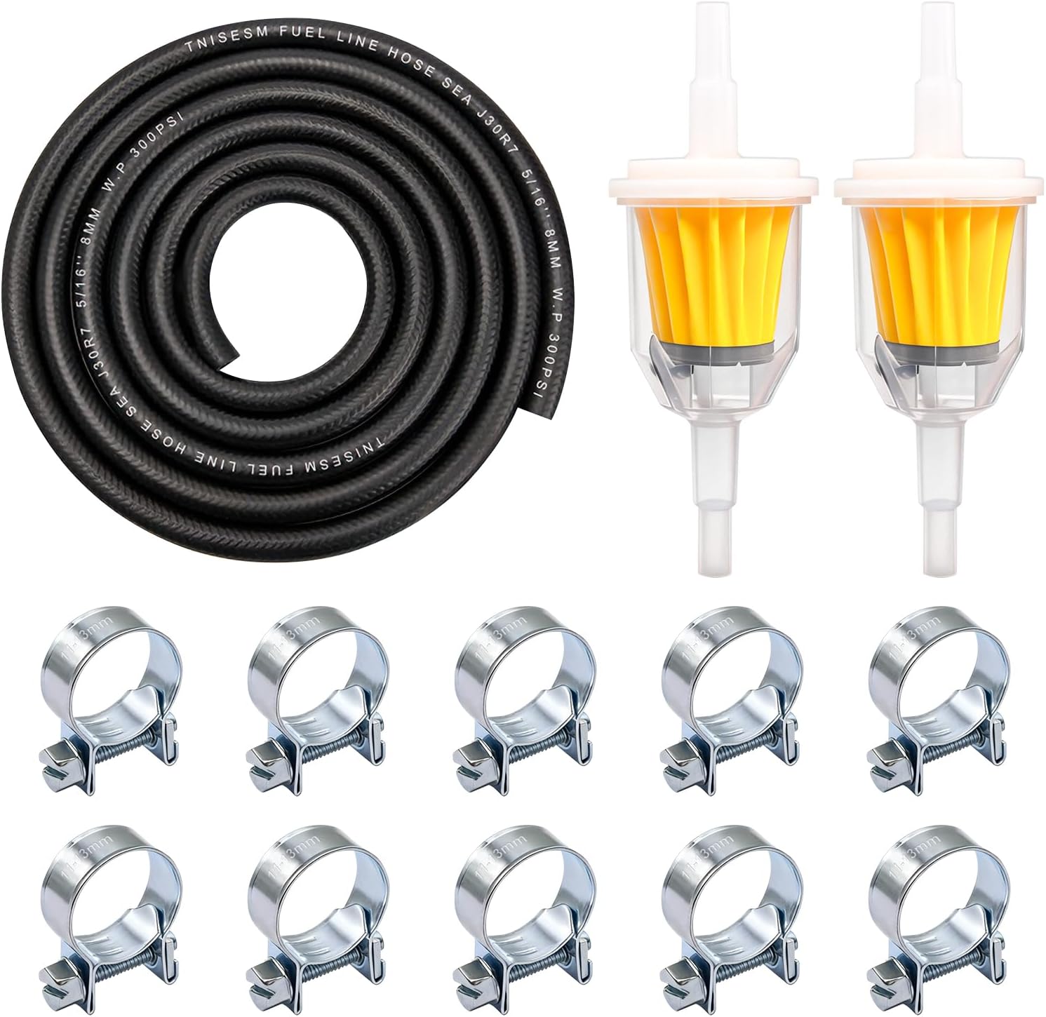 • 5 Size Fuel Line Hose Kit with Heavy-Duty Clamps: 5 high-pressure fuel hoses (3/8",5/16",1/4",1/2",3/16" ID) ×6.6ft(2m)each + 50 hose clamps. Precision-labeled sizes for quick selection: 3/16"(5mm ID),1/4"(6mm ID),5/16"(8mm ID),3/8"(10mm ID),1/2"(13mm ID)