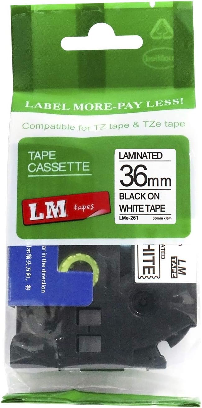 6/Pack LM Tapes - LMe-365 Laminated 36mm White Print on Black Label - LMe365This Premium Compatible TZe-365 1.5" White on Black P-touch Tape is compatible with Brother P-touch label makers that use TZe series tapes. This replacement laminated label tape is 1.5" (36mm 1.4) x 26.2' in length and can be used for both indoor and outdoor applications. This compatible label is not manufactured or sold by Brother.These labels are rugged and will holdup in freezing temperatures as well has hot/sunny environments. They have regular strength adhesive and are best suited for smooth flat surfaces.For use in p-touch Model: PT530, PT550, PT3600, PT9200dx, PT9200pc, PT9400, PT9500pc, PT9600, PT9700PC, PT9800PCN, PTD800W, PTE800W, PTP900W, PTP950W