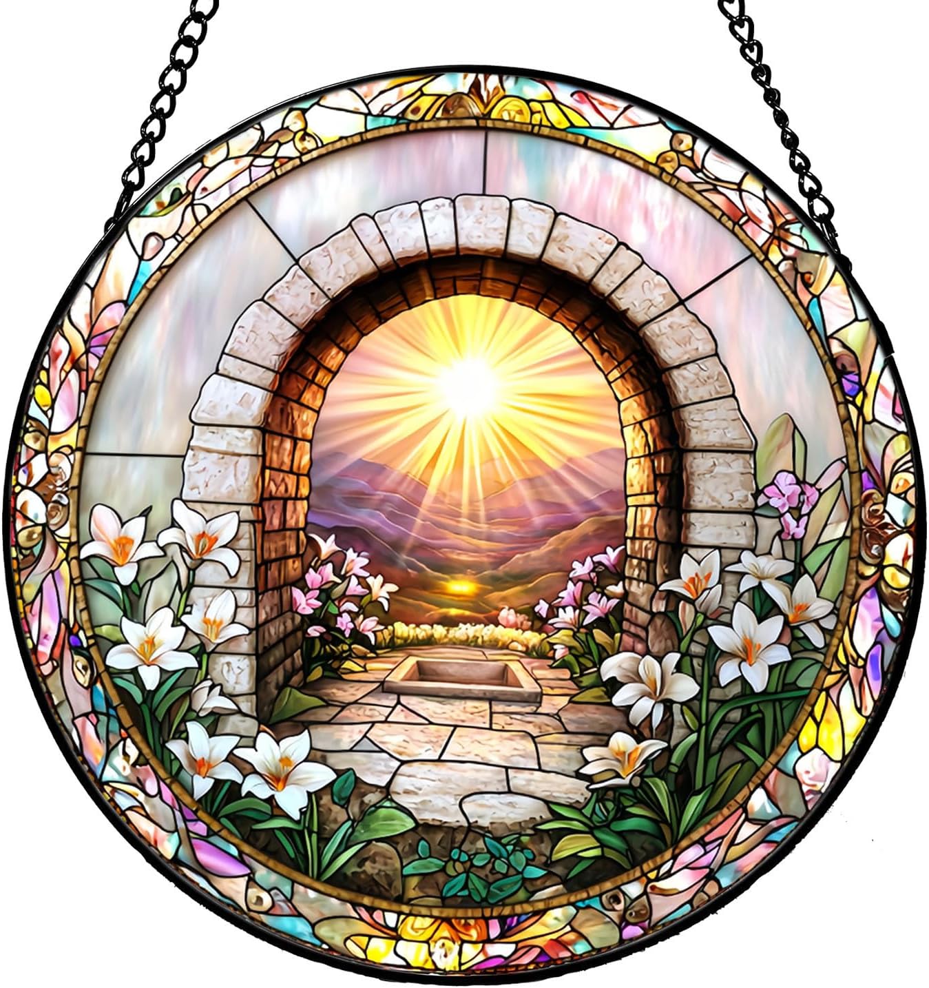More than just a decoration, this stained glass window hanging is a celebration of art, light, and the beauty of handcrafted work.When parents marking a milestone, siblings in new homes, or grandparents who adore timeless decor. Couples celebrating anniversaries or weddings will cherish it as a symbol of enduring connection.For Easter, it mirrors the season's renewal. Brighten Christmas mornings with its festive glow, surprise Mom with a burst of color on Mother's Day, or add charm to Thanksgiving gatherings. It's also perfectly suited for America's favorite occasions, it's a unique expression of care.Specifications:Material: Glass + MetalColor: MulticolourDiameter: 20 cm/ 7.87 inchChain Length: 34cm/13.4inchPackage:1 X Colorful Eggs Stained Glass Window HangingTips:1.Since our products are measured manually, please allow slight errors on size.2.Different computers display different resolutions, and the color of the actual item may be slightly different from the image above.