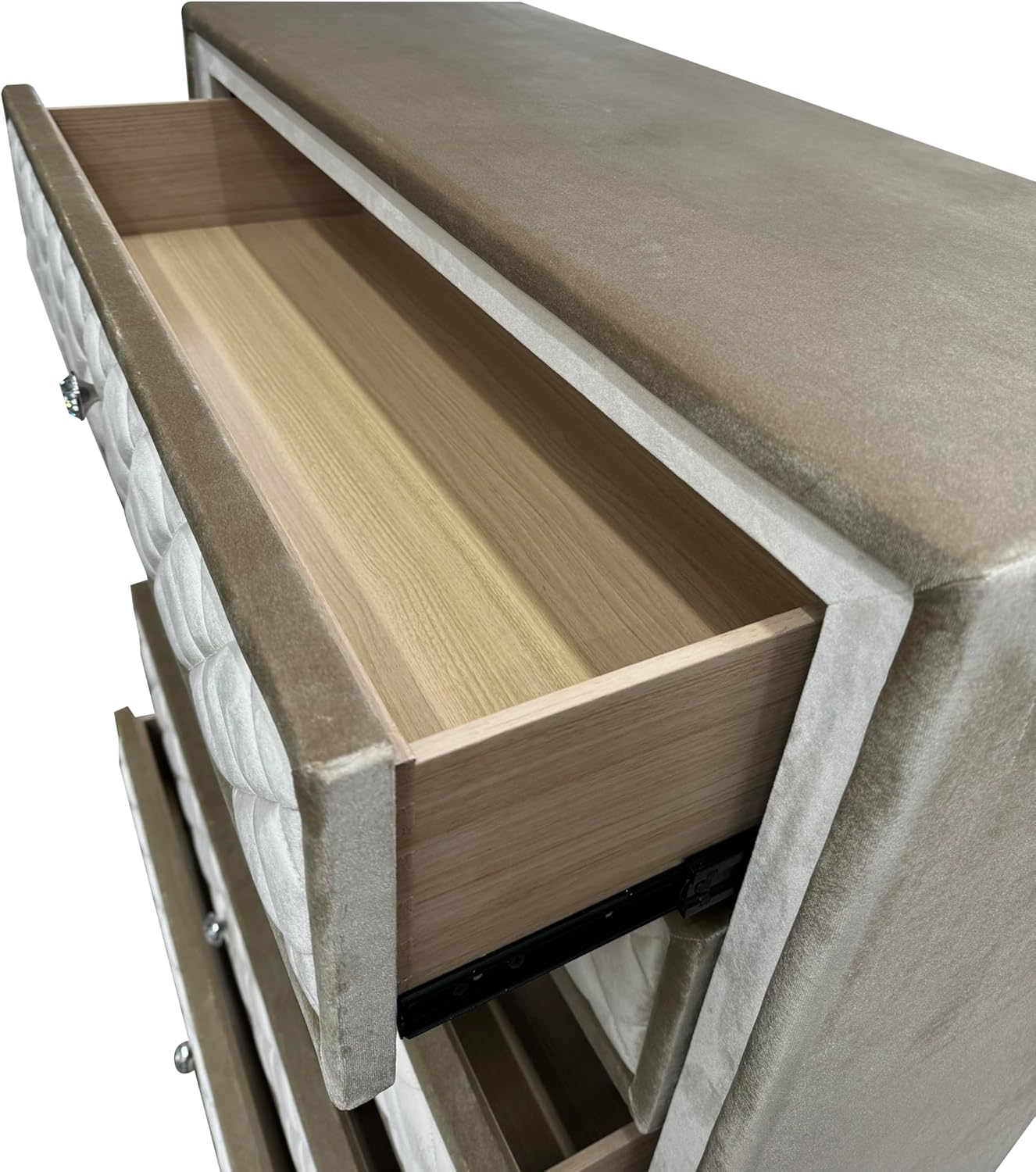 Our luxurious Lucienne chest is designed to elevate your bedroom to the next level of sophistication and glamour. This stunning chest is expertly crafted with attention to detail and quality. Upholstered in a luxurious beige velvet fabric, adding a touch of opulence and glamour to the overall design. Featuring quilted drawer fronts with crystal-like knobs. This chest includes five spacious drawers, providing ample storage space for clothing, linens, and more. The bun legs add a touch of classic elegance, creating a unique and sophisticated look that will enhance any decor.