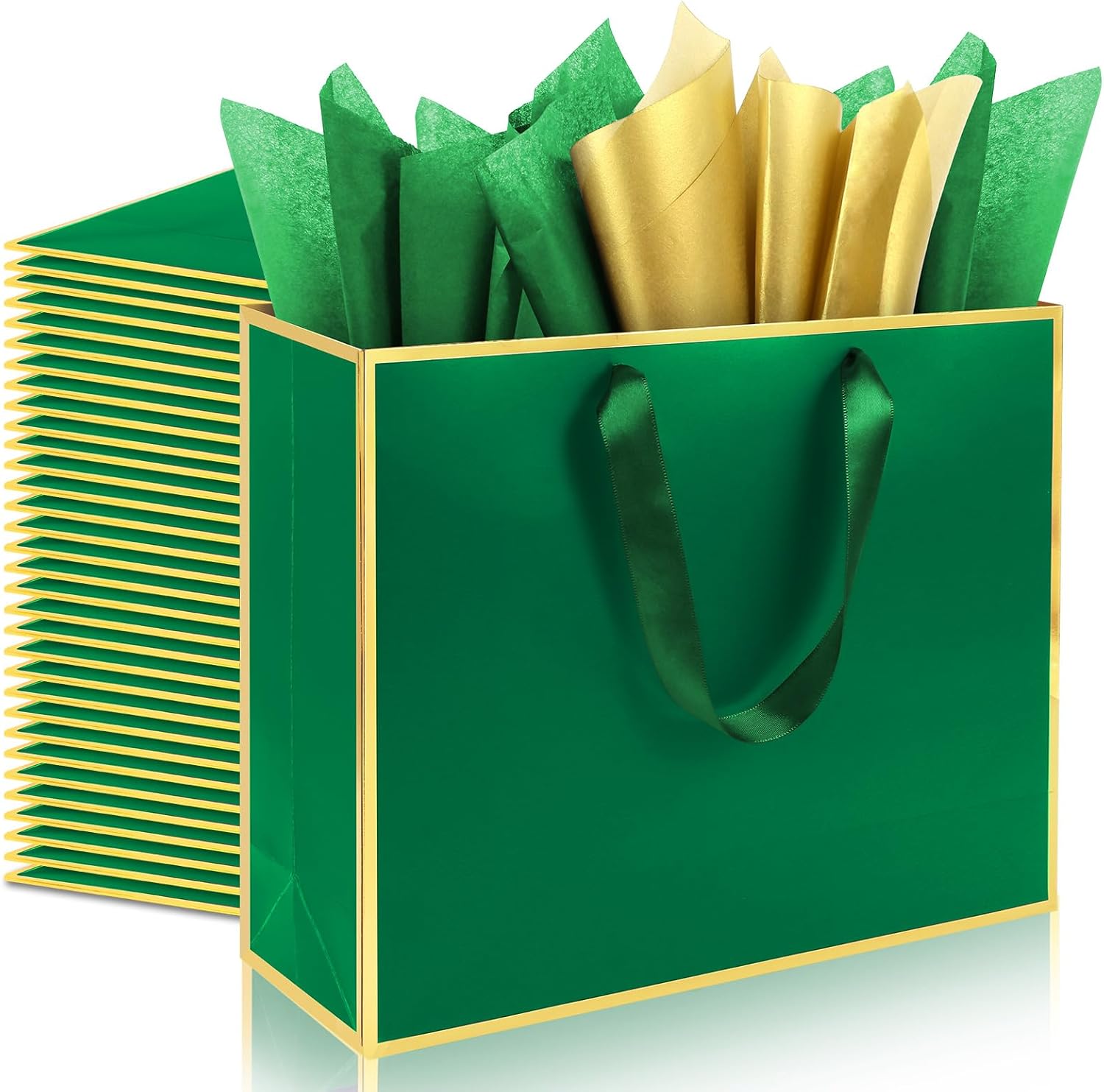 This 24pcs Deluxe Tote Gift Bag Set is designed for exquisite gifting, containing 72 sheets of lightly lined paper, easy to create high-end gift packaging. It is made of sturdy and environmentally friendly 250gsm cardboard, strong load-bearing, not easy to break, with dark blue/black/white background color and hot stamping edges, simple and elegant, and can be handwritten blessings, suitable for wedding welcome, bridesmaids and groomsmen gifts, birthday parties, baby shower, Christmas thanksgiving, or business appreciation, corporate activities and other occasions, it is the preferred choice of you to save your heart and decent gifts.