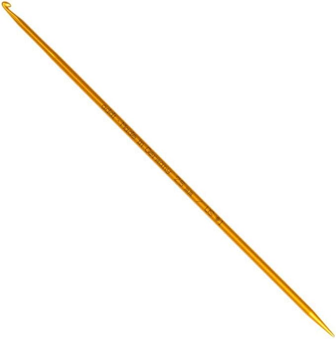 Colourful anodised addiDuett dual purpose crochet hook from addi. This practical addition enables you to combine the two crafts. Pick up stitches with the crochet hook, then knit them with the knitting needle tip. It is easy to pick up running stitches with it, which can then be knitted directly. Using the knitting needle tip to pass through your work, you can quickly draw a lifeline through.