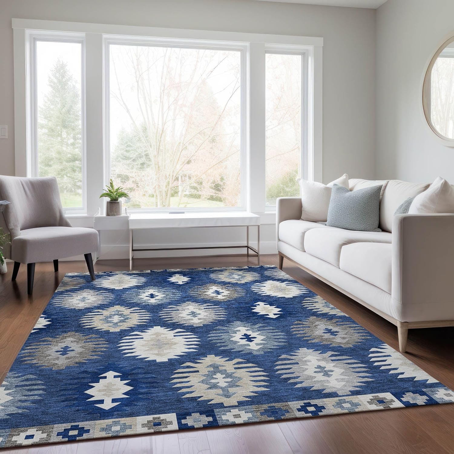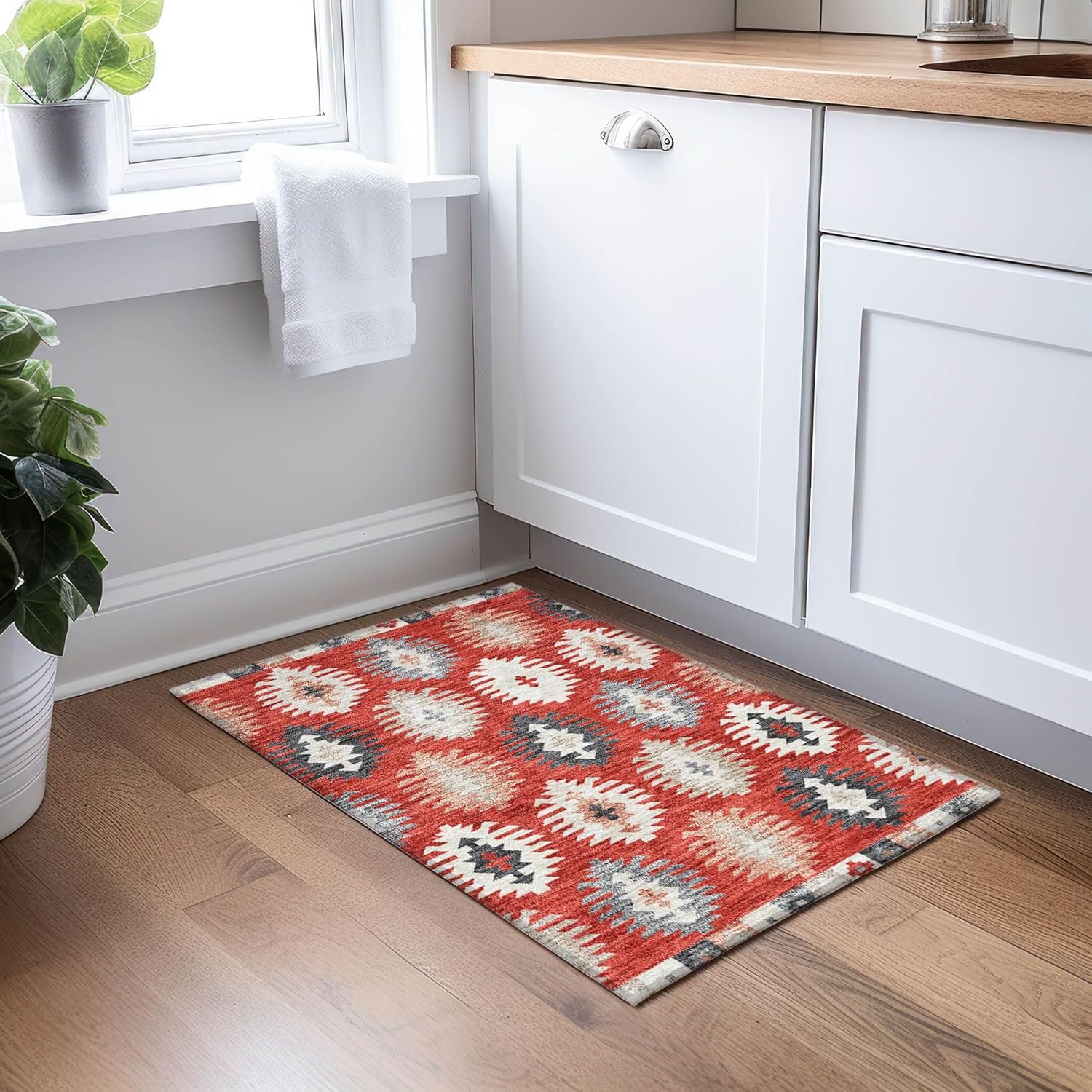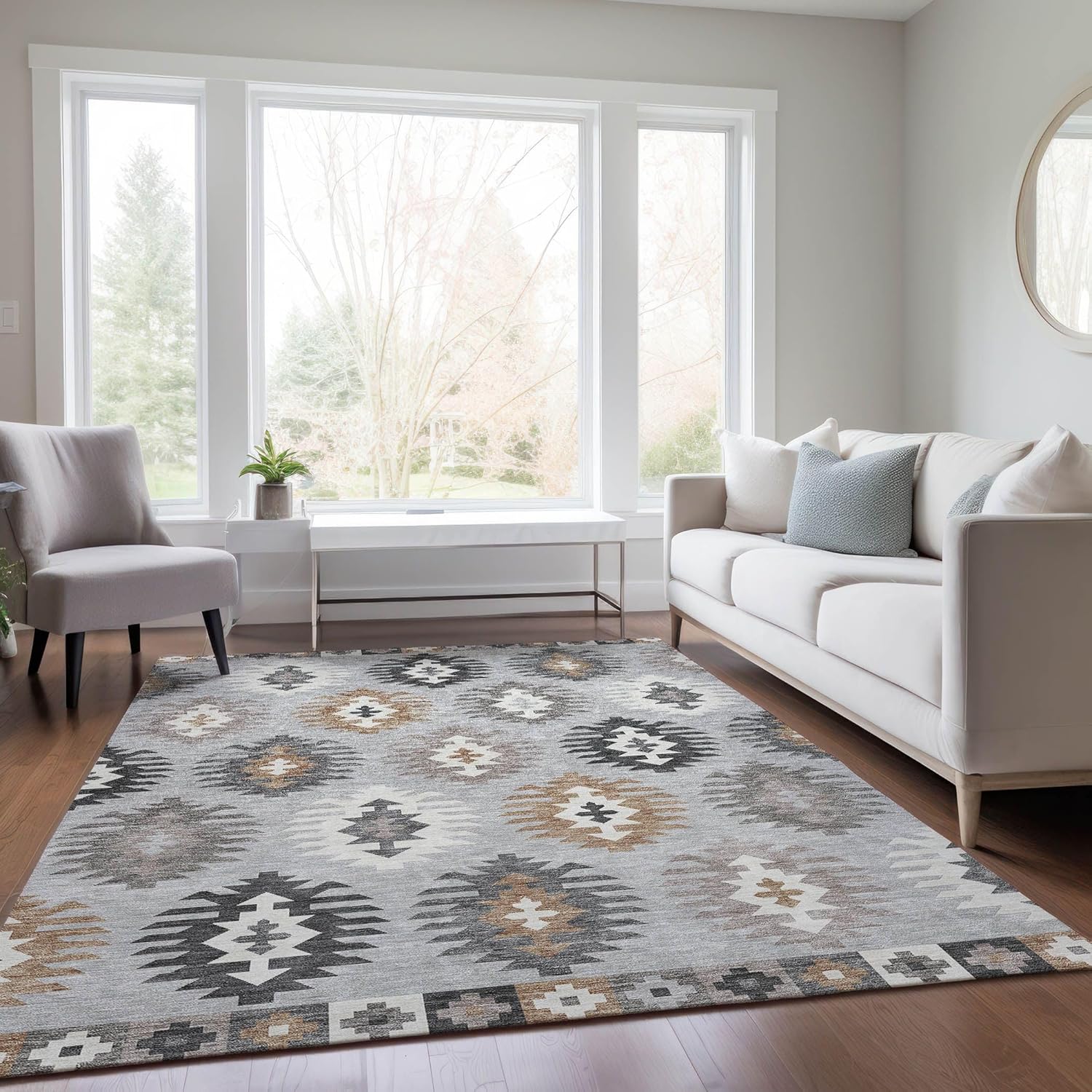 The oversized motifs and delicate border of our area rug create a transitional southwest masterpiece. It's UV stabilized to maintain its vibrant hues anywhere, ultra-thin to complement your chic interior, and machine-washable for easy care—a must-have for lively homes with pets and kids.