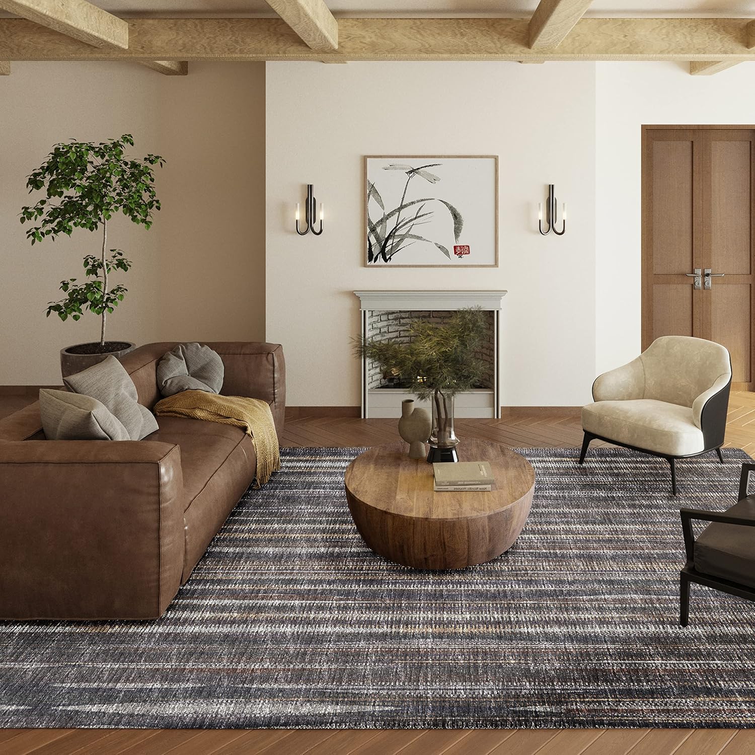 Waverly collection is an energetic striped design in understated color options. Featuring an ultra-thin area rug made with 100% polyester pile and premium non-skid backing. Final crafting in USA using domestic processing on an imported substrate. The entire family will love these versatile transitional flat weave area rugs. They are UV Stabilized for indoor and outdoor spaces. Shake out or use straight suction with vacuum, do not use a beater bar. Machine washable in cold water and air dry, some sizes may be too large for a residential washing machine and is family and pet friendly.