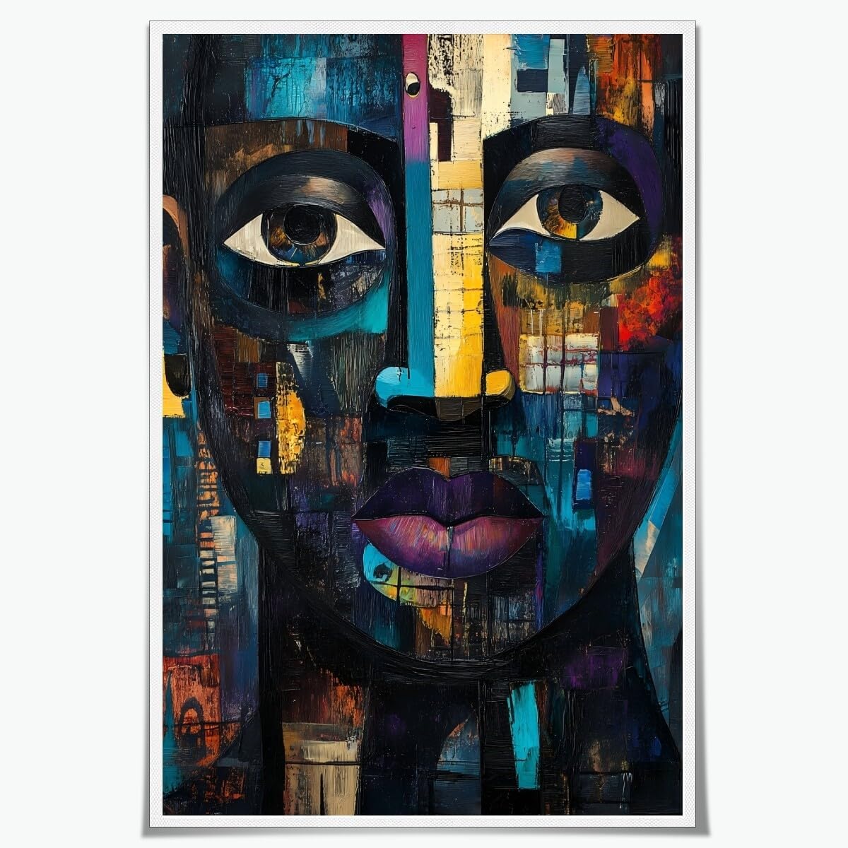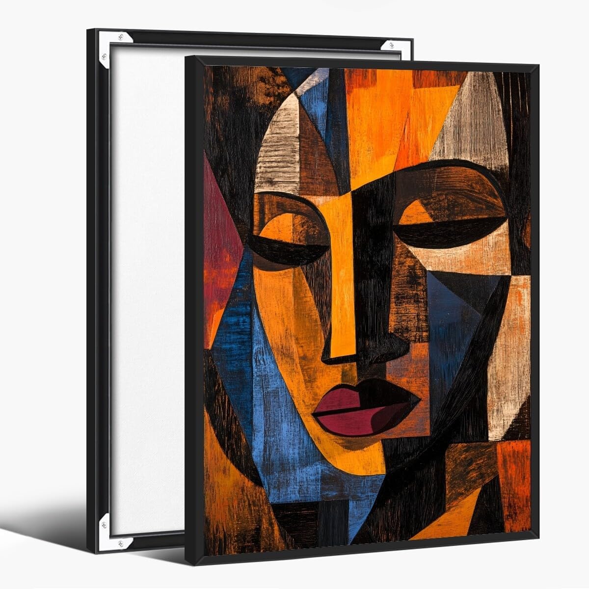 Size Options:This vibrant and inspiring African masks Poster comes in five convenient sizes to suit any space:8x12 inches12x18 inches16x24 inches20x30 inches24x36 inchesFrame Options:Choose from three elegant framing options:Unframed – For a minimalist, clean look where you can frame it yourself or hang as-is.Wood Frame – A built-in, sturdy frame that is wrapped with the canvas, providing a smooth, seamless finish. The frame is hidden inside the canvas to ensure no image details are obstructed, giving a sleek, professional appearance.Black Aluminum Frame – A modern, sleek option that complements the bright colors and bold design of the artwork. Material:Printed on high-quality canvas, the canvas material provides a durable, long-lasting finish that will maintain its beauty for years to come.Overall Description:This stunning African tribal masks painting features African faces in the style of Cubism, with influences from Picasso and Guernica. Bold colors, abstract shapes with cultural elements, high contrast between light and dark areas, a fusion of modernism and African art styles, emphasis on facial expressions, a sense of movement and tension, an artistic representation that captures the essence of Africa's culture and heritage.