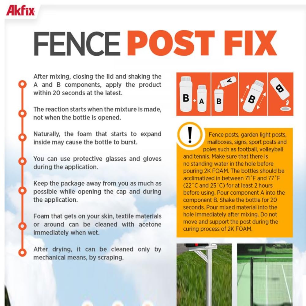 • 𝗩𝗘𝗥𝗦𝗔𝗧𝗜𝗟𝗘 𝗔𝗣𝗣𝗟𝗜𝗖𝗔𝗧𝗜𝗢𝗡𝗦: Discover the versatility of our post hole foam beyond traditional fence post mix. From garden lights to sports posts, Akfix Fence Post Fix adapts to set posts and poles into the ground, including fence posts, anchors, gates, mailboxes, flagpoles, deck posts, football, volleyball, soccer, tennis posts, bird houses, bollards, clotheslines, satellite dishes, and more.