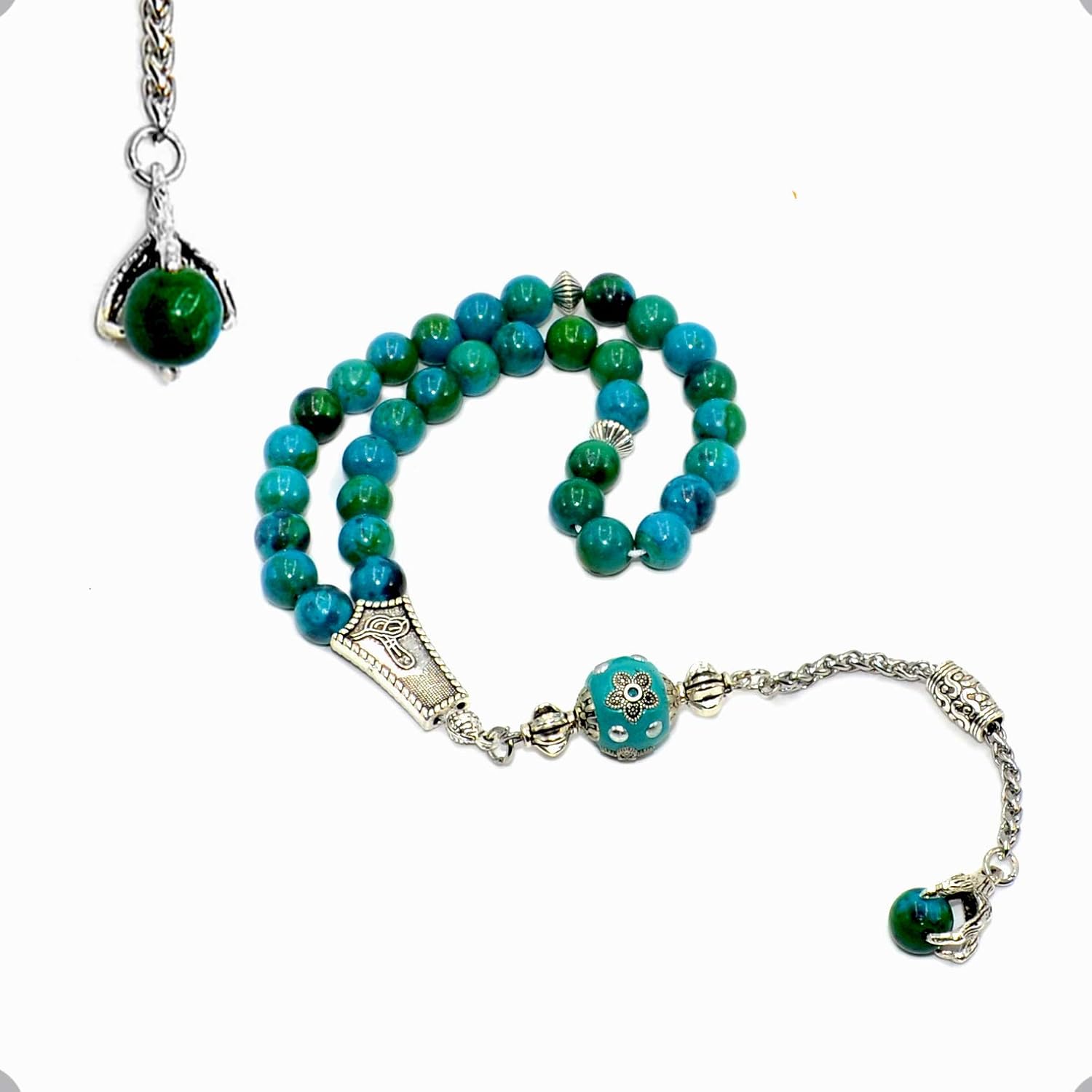 Nice design Muslim prayer beads.This Turkish style prayer beads are smooth to the touch and enjoyable to use. Information about these natural stones is based on individual experience and should not be considered as medical advice. Inadvertent use of it will not be our responsibility.ATTENTION:As different computers display colors differently, the actual item may vary slightly from the above images, thanks for your understanding.All dimensions are measured by hand, so there might be a very slight variation.SAFETY INFORMATION:Detergents and lotions can damage the finishing and colour of the stones / crystals.So don’t dip your stones / crystals in water. The Product is make from natural stones so small holes, crack marks on the surface or inside the stones are often visible.