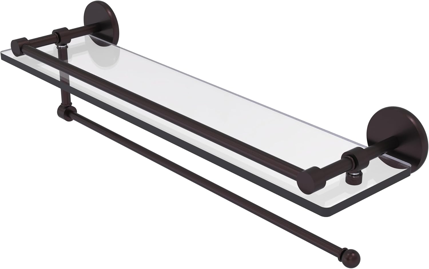 Maximize space and efficiency with this beautiful glass shelf and paper towel holder combination. Gallery rail will keep your items secure while the integrated paper towel holder provides a creative space for your roll. Made of solid brass and tempered