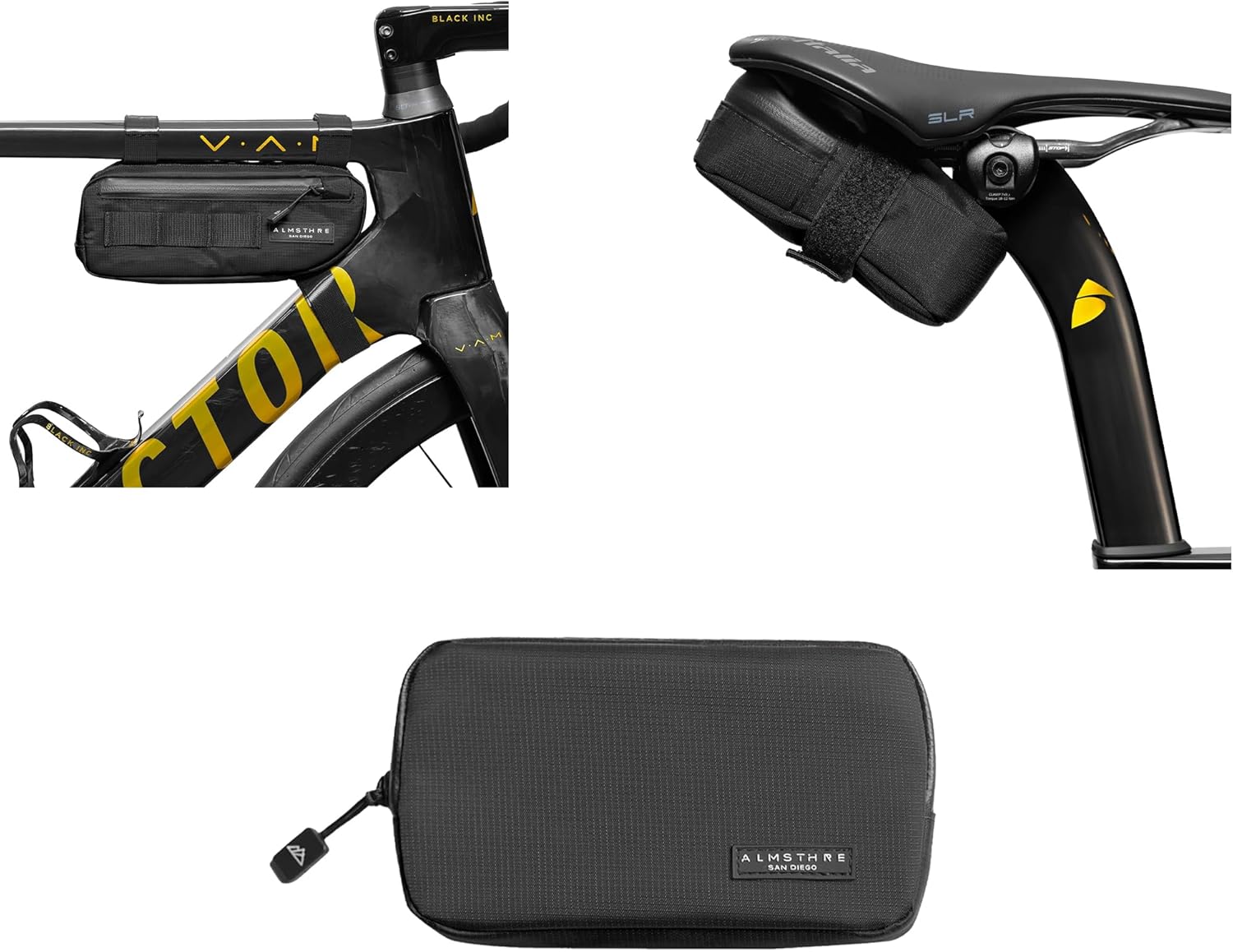 At ALMSTHRE, we believe in curiosity, community, and the art of escape. Our gear is built for those who never stop exploring — for riders chasing what’s around the next corner. This bundle is made for that journey. The ALMSTHRE Compact Frame Bag Bundle in Blue includes three essentials designed to perform: our Compact Frame Bag, Saddle Bag, and Ride Wallet. The bicycle Frame Bag is your one-size-fits-all ride companion—built to carry just what you need without getting in the way. Measuring 8.5 inches long, 2 inches wide, and 3 inches tall, it’s designed to work with nearly all frame sizes while still leaving space for large bottles on long rides. Dual waterproof zippers open into a two-compartment system with a center divider, mesh pocket, and credit card slot. Inside, the hi-vis blue liner makes everything easy to find. Comes with two removable Velcro straps and a bonus pair of silicone straps for top tube flexibility. The bicycle saddle bag keeps your gear secure and accessible. Sized at 3 inches wide, 5.25 inches long, and 2 inches tall, it offers 0.5 liters of storage and weighs just 58 grams. It’s large enough to carry two tubes and two CO2 cartridges—or just your ride essentials. Made from premium ripstop material, it includes reinforced wear points, an internal pocket, a high-visibility liner, a waterproof zipper, and a secure single seat rail strap. The bike pouch offers three internal organizer pockets and is 7 inches long by 4 inches wide, making it big enough to fit most phones. It’s made from ripstop nylon with a waterproof zipper to keep your essentials safe. Tuck away your ID, credit cards, and cash, and ride worry-free. Whether you're packing light or bringing it all, this bundle is made to move with you—wherever the ride leads.