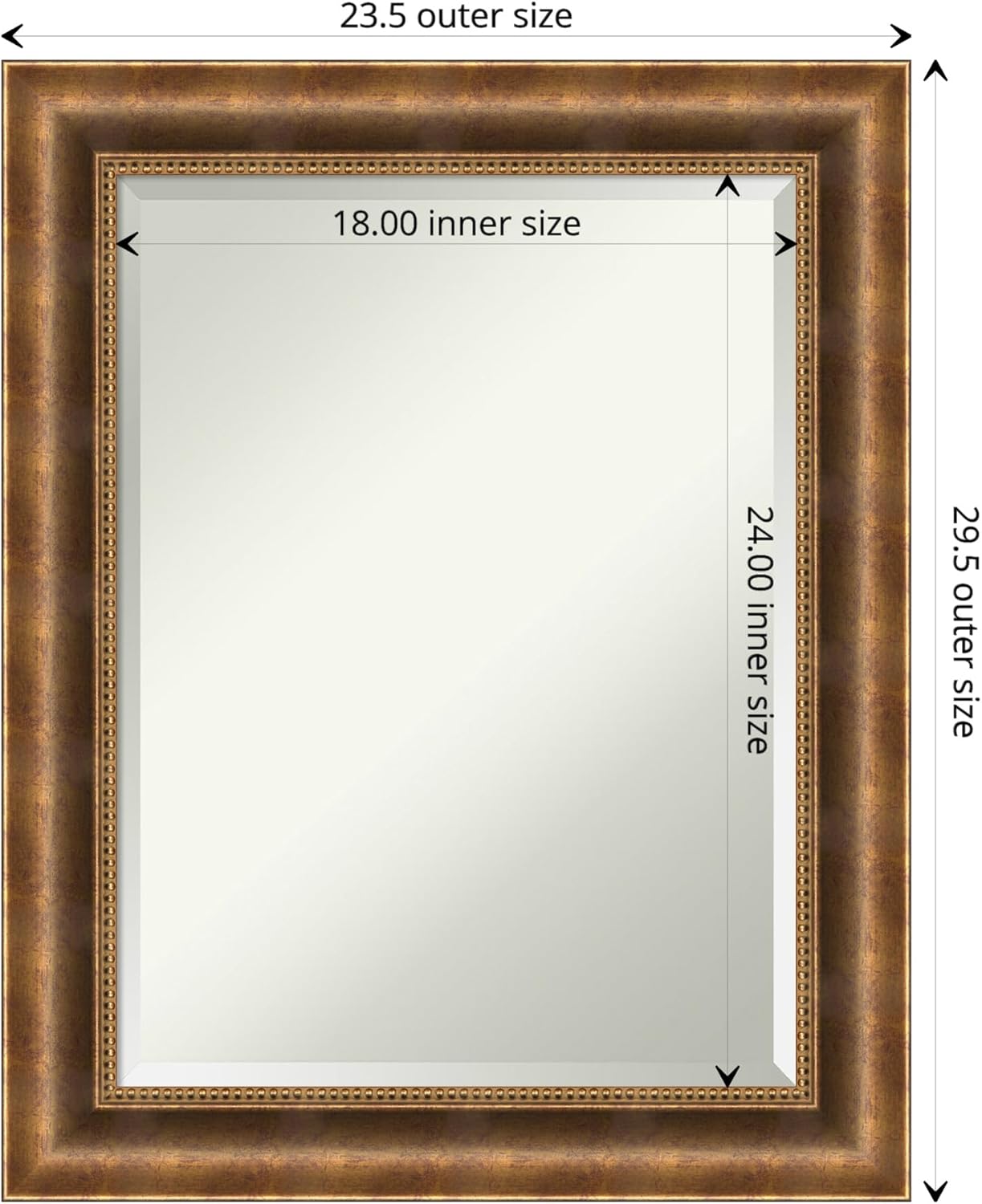 PRODUCT: Amanti Art Beveled Wood Wall Mirror; OUTER SIZE: Exactly 45.5 x 35.5 inches; FRAME: Manhattan Bronze; FRAME FINISH: Antique Bronze; FRAME COLOR: Bronze. The Manhattan Bronze frame is a burnished bronze frame with a slightly lifted outer ridge and a wide face that curves to an inner golden beaded edge. Give your home or office the finishing touch with this 100% real wood-framed wall mirror. Individually made using traditional custom framing techniques, it has the quality you would expect from your local frame shop. It holds its value with premium finishing that can be appreciated up close. Because of our attention to detail and focus on artistry, architects, interior designers, and homeowners alike choose this mirror to create beautiful living spaces.