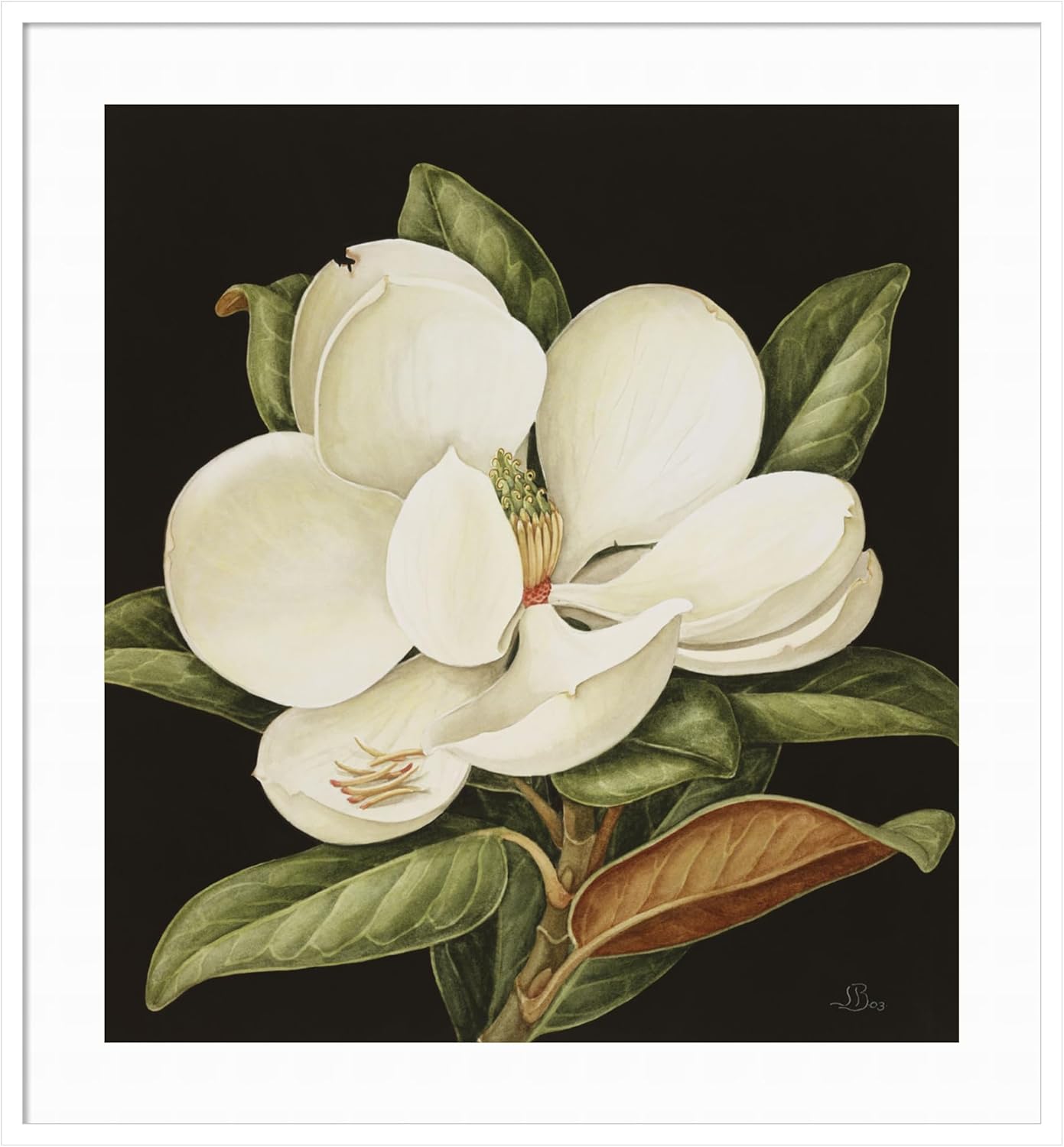 CUSTOM ARTWORK DETAILS: TITLE: Magnolia Grandiflora 2003. ARTIST: Jenny Barron. DESCRIPTION: A luminous white magnolia in full bloom unfolds its petals against a deep, obsidian backdrop. Each petal is rendered with meticulous care, suggesting a velvety texture that contrasts with the verdant gloss of the leaves. This striking botanical portrait evokes a sense of timeless elegance and the quietude of a midnight garden. OUTER SIZE: 32 in. W x 35 in. H. 100% REAL WOOD FRAME DETAILS: The Ashton Black frame is a slightly mottled matte black frame with a lifted outer ridge that curves to an inner gold beaded edge. This Amanti Art framed art print was created by Jenny Barron and printed by Amanti Art in Madison WI. The print is giclee printed using fade-resistant inks for picture-perfect detail and incredible depth of color and finished with a 100% real wood frame. Individually made using traditional custom framing techniques, it has the quality you would expect from your local frame shop. Because of our attention to detail and focus on artistry, architects, interior designers, and homeowners alike choose this framed art print to create beautiful living spaces.