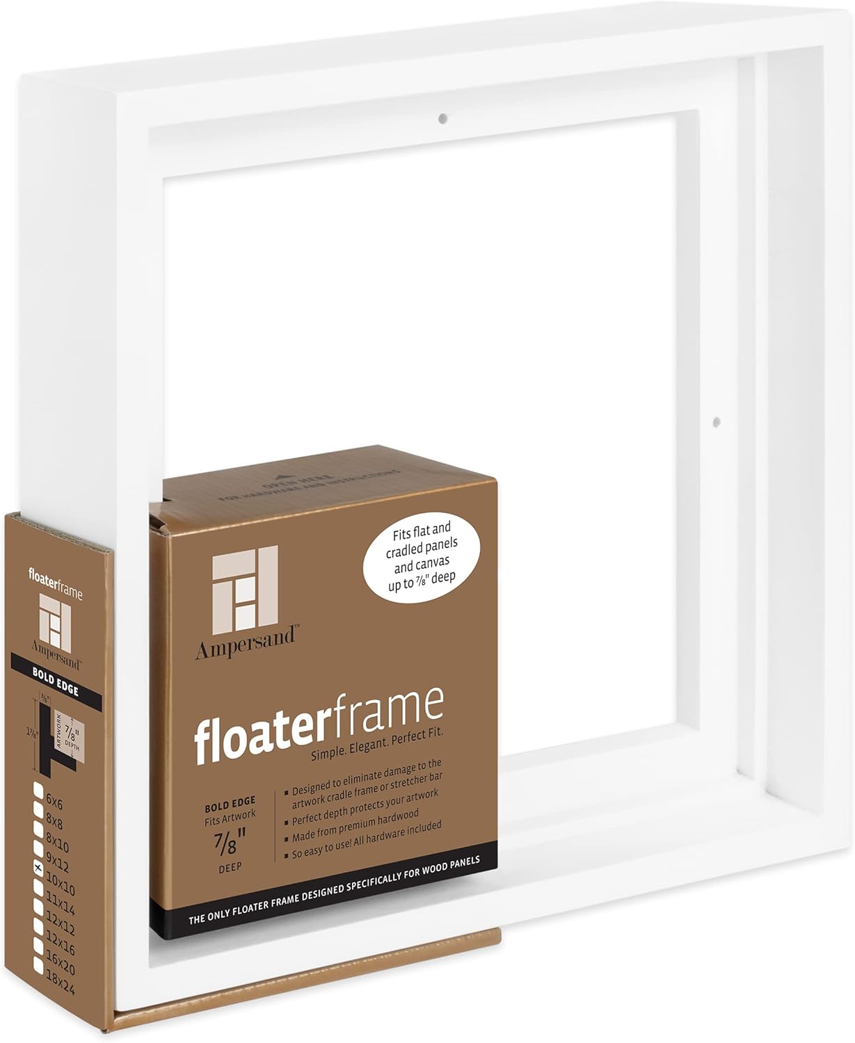 At Ampersand, we noticed the floater frames available to artists didn't properly accommodate wooden panels. We saw that the base of the frame didn't align with the panel's cradle and the front of the frame didn't protect the face of the artwork. Ampersand remedied these issues by expanding the base of its Floaterframe to match up with the cradle of a wooden panel and extending the frame profile, so the artwork sits just below the front of the frame, protecting the artwork from damage. We also added countersunk holes on the back for the hardware, so the screws that attach the artwork to the frame don't protrude. This keeps your artwork flush with the wall and prevents screws from scratching the wall. Not only did we create a better frame, but we also took it one more step. Everything you need to frame your artwork is included, from the eye screws and coated wire to screws that attach to the artwork, and bumper pads for the back corners. Even the hook and nail are included so you can display your newly framed artwork. Are you framing a flat panel without a cradle? The 7/8" depth option includes a set of riser blocks in the hardware pack. This is a great solution for displaying your artwork on a panel, even if the panel doesn't have cradles. Ampersand offers two great styles of Floaterframes to choose from: We have a Bold style, with a dramatic wide facing, and a Thin style with an elegant, narrow facing. Both styles are available in Black, White, Maple, and Walnut, and are available for 7/8" and 1 1/2" depth artwork on cradled panels or stretched canvas. With the Bold style, the outer dimensions are the same for both depths. This allows artists to frame artworks with different cradle depths in uniform frames. The Thin style has a different approach. The outer profile for the 7/8" depth is more shallow versus the deeper 1 1/2" profile. Designed for Ampersand panels and ideal for use as a canvas frame. Ampersand Floaterframe: Simply the Easiest Floater Frame You’ll Ever Use.